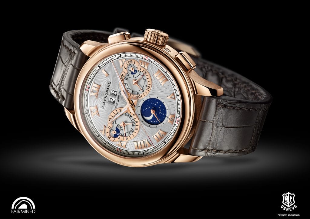 Derrière son élégance et sa fonctionnalité, la L.U.C Perpetual Chrono est le fruit d’une exigence qui s’incarne dans ses matières d’exception.Le boîtier de 45 mm de la L.U.C Perpetual Chrono est entièrement façonné en or éthique 18ct certifié Fairmined. Chopard est en effet la première entreprise d’horlogerie et de joaillerie de luxe à s’être engagée à utiliser 100% d’or éthique pour l’ensemble de ses créations depuis le mois de juillet 2018. Le cadran de la L.U.C Perpetual Chrono est recouvert d’or couleur argenté satiné. Il est parcouru d’un motif soleil guilloché à la main qui diffuse son jeu de lumière depuis le double guichet de la grande date. Le choix de matières nobles s’étend jusqu’au calibre L.U.C 03.10-L. En effet, il est réalisé en maillechort, alliage naturellement gris clair qui se prête idéalement aux traitements de surface mais ne pardonne pas la rayure. Plus dur que le laiton, le maillechort offre une plus grande résistance à l’oxydation et se patine naturellement. Toute erreur lors de l’exécution des côtes de Genève, perlages, satinages et polissages omniprésents sur le mouvement est irrattrapable. Ce mouvement exige les mains les plus expertes des ateliers horlogers de Chopard Manufacture.