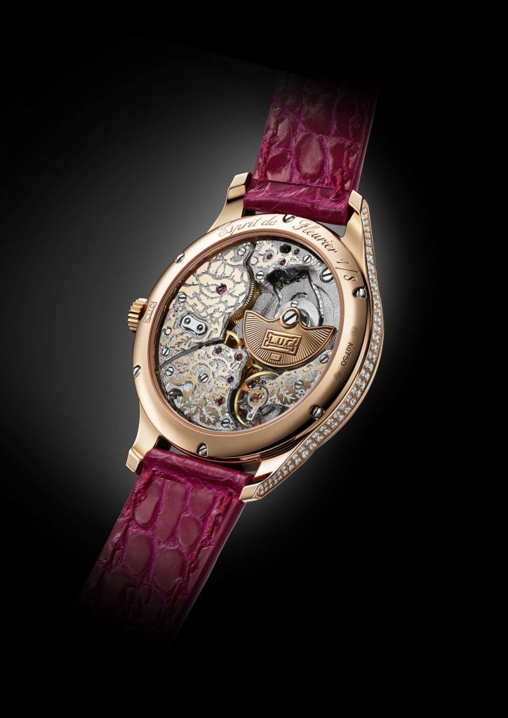 Côté mouvement, on découvre le calibre L.U.C 96.23-L entièrement gravé à la main grâce à l’art délicat de la gravure fleurisanne. C’est au XIXe siècle que cette technique de décoration a connu son âge d’or. Dans les ateliers, on prenait soin de pousser le souci de la perfection jusqu’à graver les mouvements de délicates volutes et de motifs floraux. Un art de la patience et de la précision auquel la Maison Chopard a décidé redonner ses lettres de noblesse.