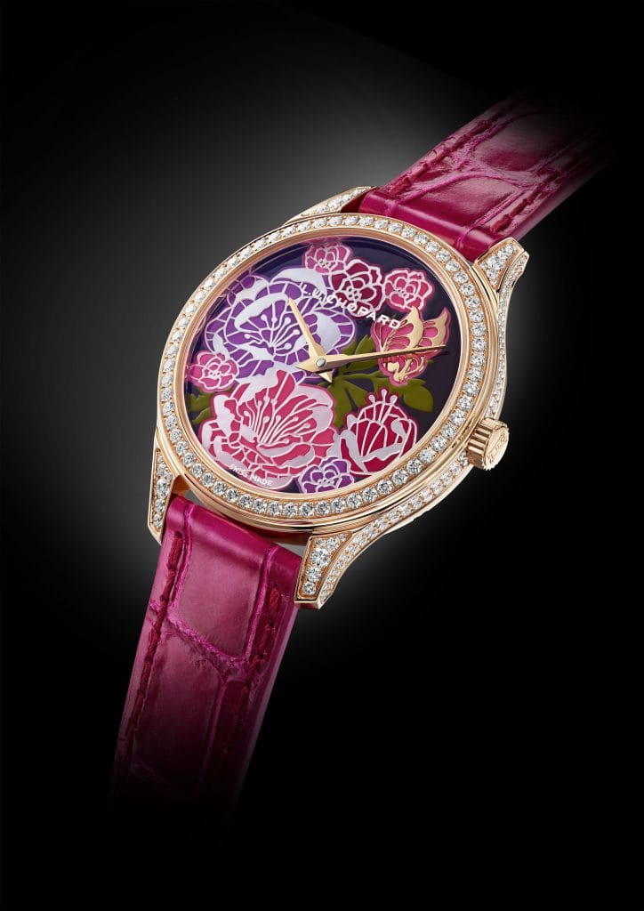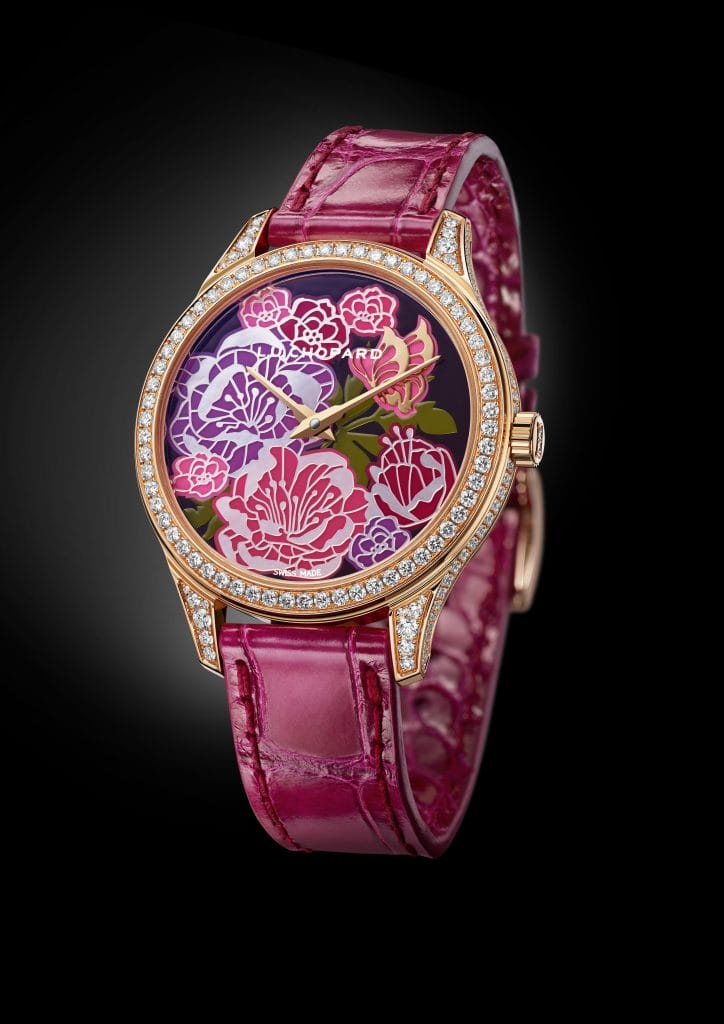 L’incomparable beauté de la pivoine est un thème que la manufacture honore année après année, interprétant de diverses manières cette fleur délicate en utilisant comme support d’expression une montre L.U.C XP pour femmes d’un diamètre de 35 mm. L’occasion rêvée pour la manufacture de mettre en lumière tous les métiers d’art qui sont maîtrisés dans ses ateliers. A ce rendez-vous, aussi éphémère que la floraison d’une pivoine, les collectionneurs ne sauraient manquer.