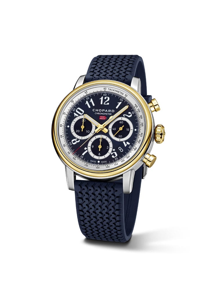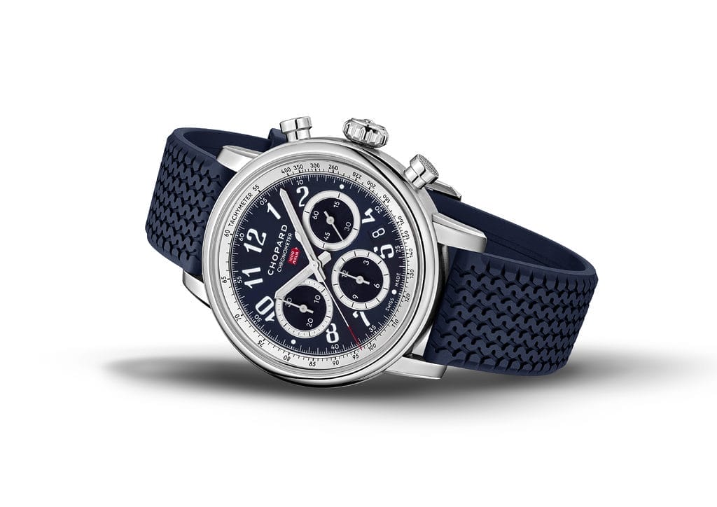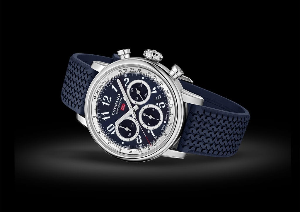 Chopard poursuit ainsi une longue tradition de bracelets sportifs en caoutchouc. En 1998, donnant vie à l’idée conjointe de Karl-Friedrich Scheufele et Jacky Ickx alors qu’ils participent aux 1000 Miglia au volant d’une Porsche 550RS A Spyder, les ateliers de la Manufacture comptent ainsi parmi les premiers à s’approprier ce matériau au fort potentiel créatif sur les bracelets des chronographes Mille Miglia. Cette tendance, que la collection n’a cessé d’alimenter, s’est par la suite diffusée largement dans le paysage horloger.
