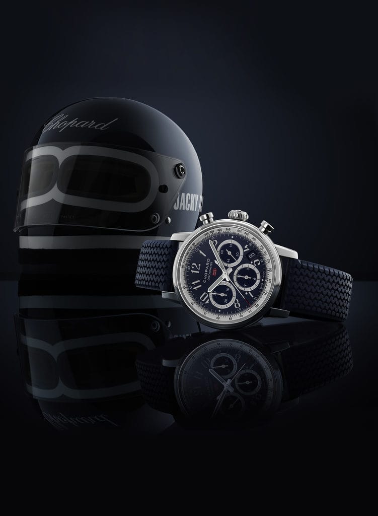 Pour sculpter l’allure de ce nouveau garde-temps, Karl-Friedrich Scheufele et Jacky Ickx se sont inspirés de l’esthétique d’un casque emblématique de ce dernier. S’il se démarque des pilotes de son temps en de nombreux aspects, Jacky Ickx est aussi, en 1969, le premier à porter le casque intégral. A sa demande, son fournisseur de l’époque conçoit avec lui un casque qui protège mieux la tête lors des compétitions, les casques d’alors proposant une sécurité que Jacky Ickx juge insuffisante.