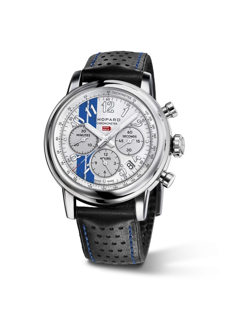 Pour célébrer les 70 ans de Porsche, Chopard a dévoilé la montre Mille Miglia Classic Chronograph Racing Stripes Edition, un modèle en édition limitée à 50 pièces. En hommage à l’esprit des courses automobiles américaines, le cadran et le fond de la montre ont été dotés de rayures rappelant celles qui avaient décoré les voitures de course de l’équipe Cunningham en 1951. En l’honneur de cet anniversaire et du lancement de cette nouvelle montre de la Collection Mille Miglia, collection emblématique de la Maison Chopard, Karl-Friedrich Scheufele, co-président de Chopard ainsi que le légendaire pilote de course, Jacky Ickx, ont organisé un dîner exclusif le jeudi 27 septembre au sein du Chopard Heritage Display. Parmi les invités figuraient Fritz Enzinger, vice-président de Porsche LMP1, Andreas Seidl, directeur de Porsche LMP1, ainsi que les champions et pilotes de légendes Porsche, parmi lesquels figuraient Derek Bell, Timo Bernhard, André Lotterer, Earl Bamber, Neel Jani ainsi que d’autres invités de renoms.