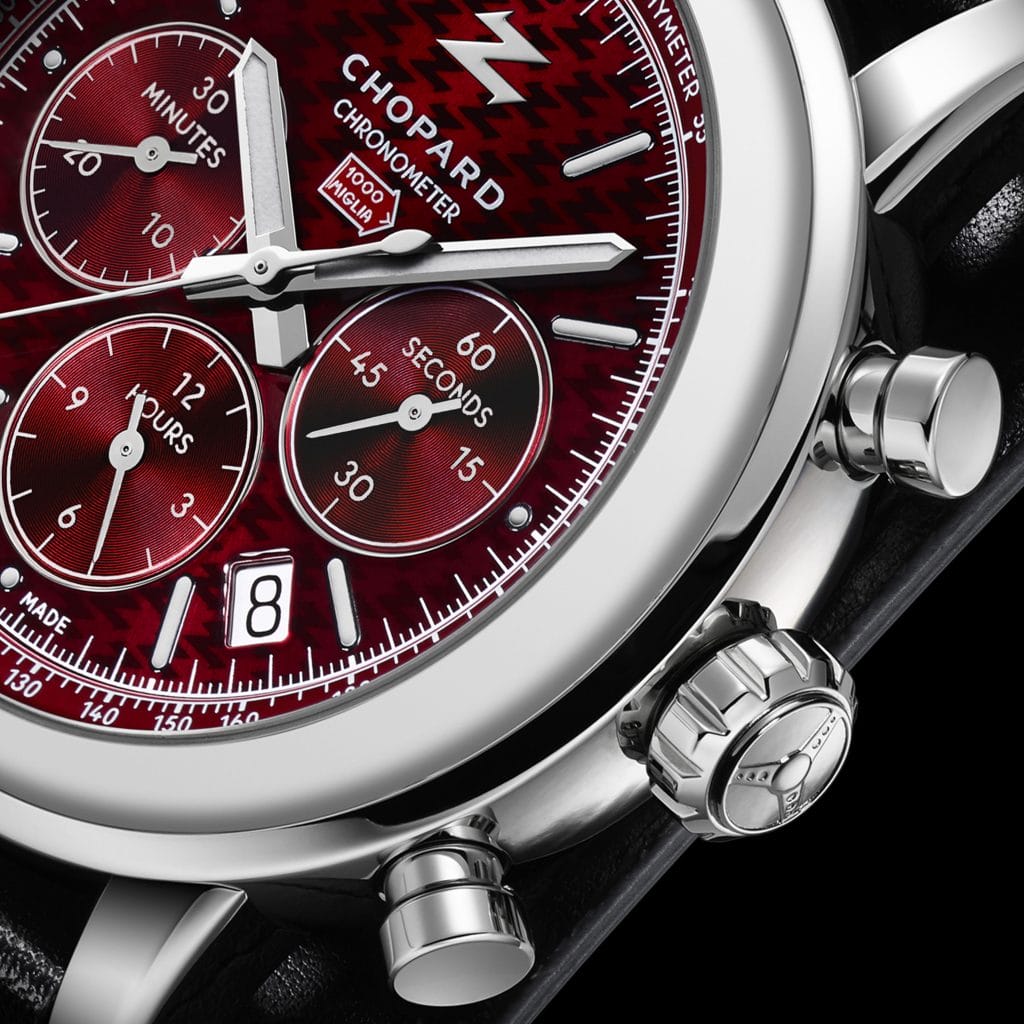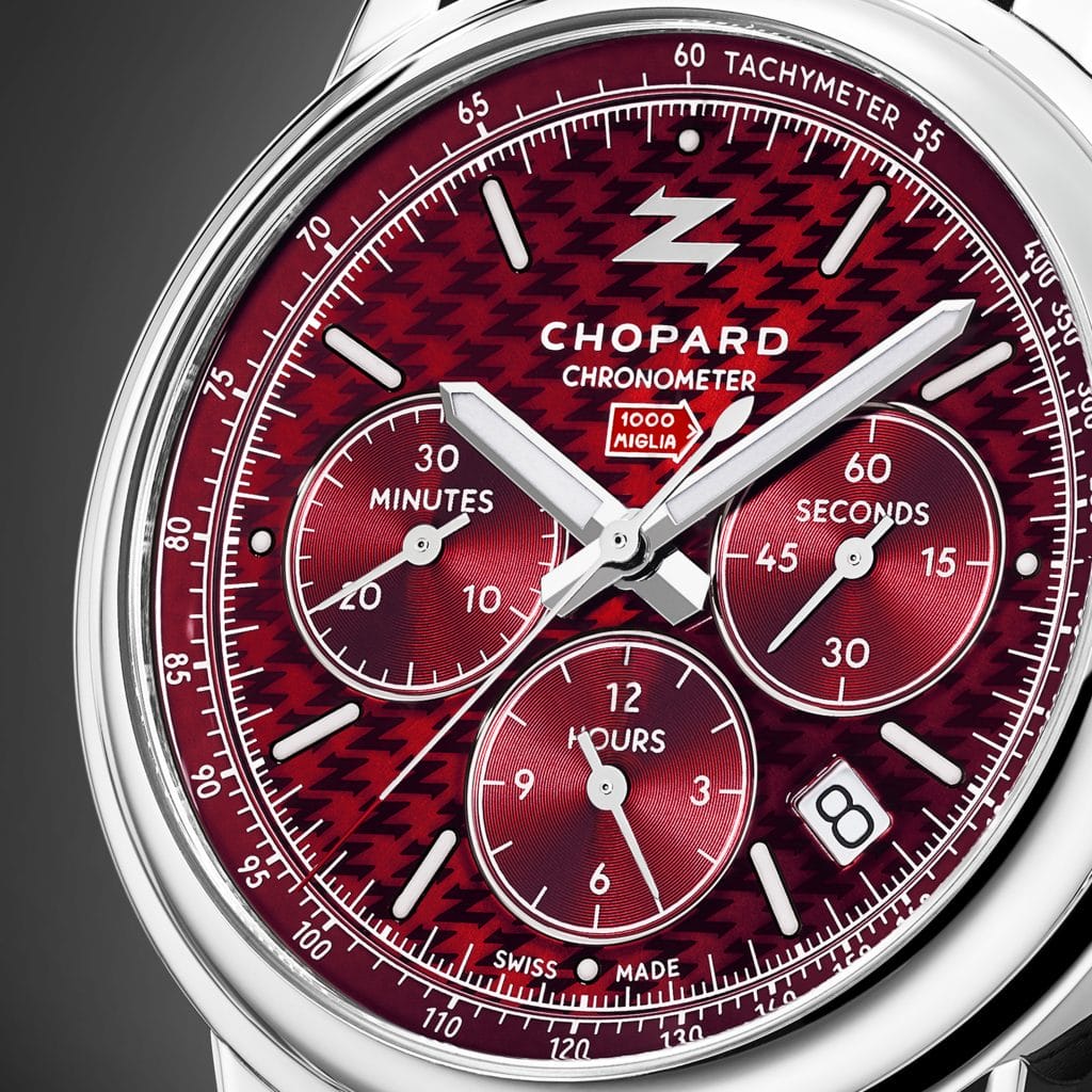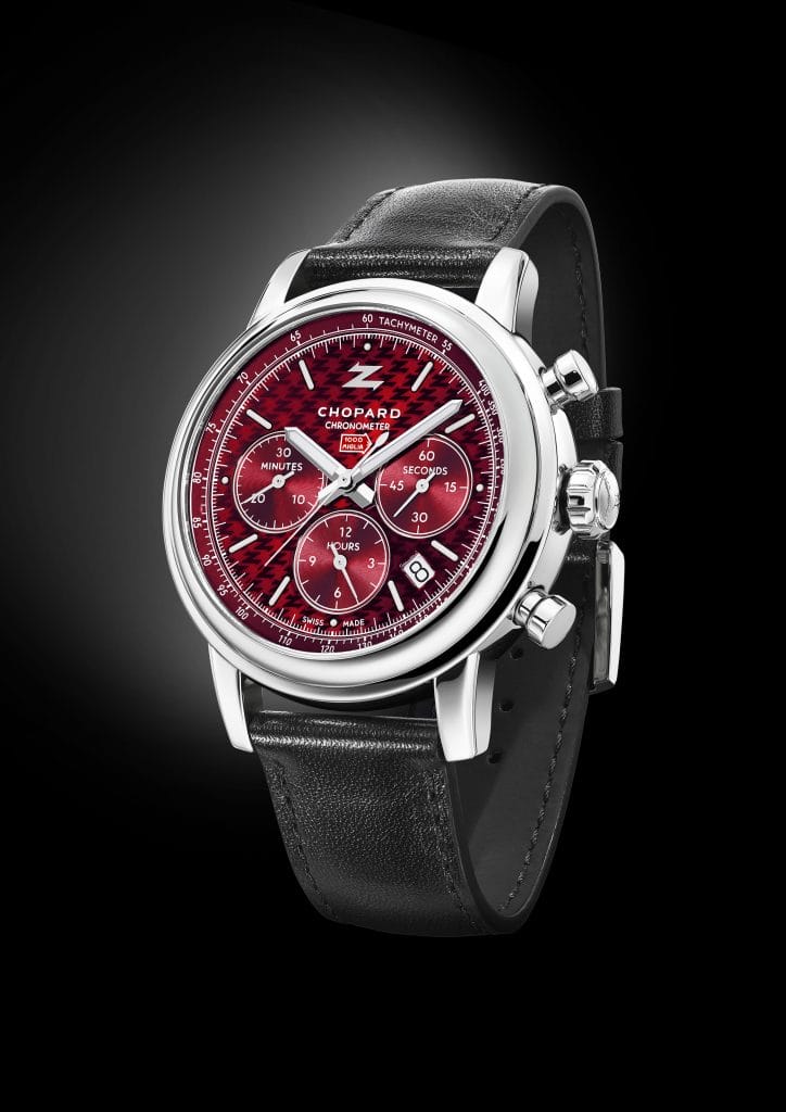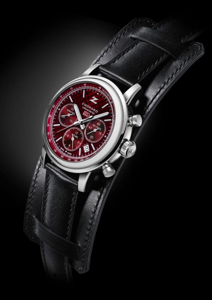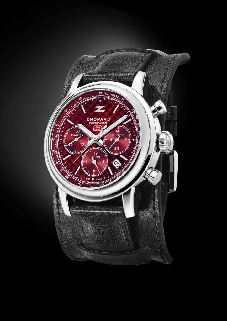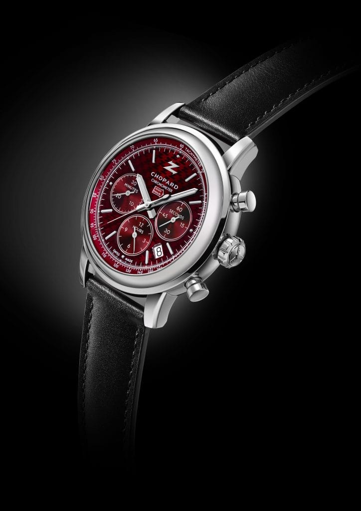 Sur la base de ce calibre chronographe taillé pour la performance, Chopard et Zagato ont alors imaginé une montre racée, parfaite pour les amateurs d’endurance sur asphalte. Un soin particulier a été apporté aux détails qui font tout le style de la pièce, à commencer par un cadran avec motif reprenant le Z de Zagato d’un magnifique rouge laqué, teinte fétiche du designer milanais comme de la Mille Miglia. Pour rappeler la paternité de cette montre, on retrouve le logo des deux Maisons à midi, entourés d’index bâtons peints de Superluminova, comme les aiguilles pour assurer une parfaite lisibilité en toutes circonstances. Le caractère sportif du chrono est encore souligné par le rehaut en aluminium noir gradué d’une échelle tachymétrique. Autant dire un accessoire indispensable qui permet de calculer la vitesse moyenne en course et dont Zagato a su faire bon usage par le passé pour avoir remporté à huit reprises la course historique de la Mille Miglia sur 24 participations. Un record !