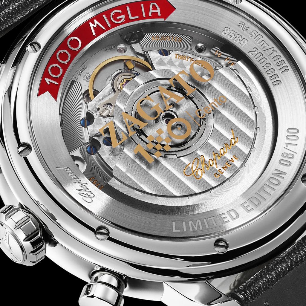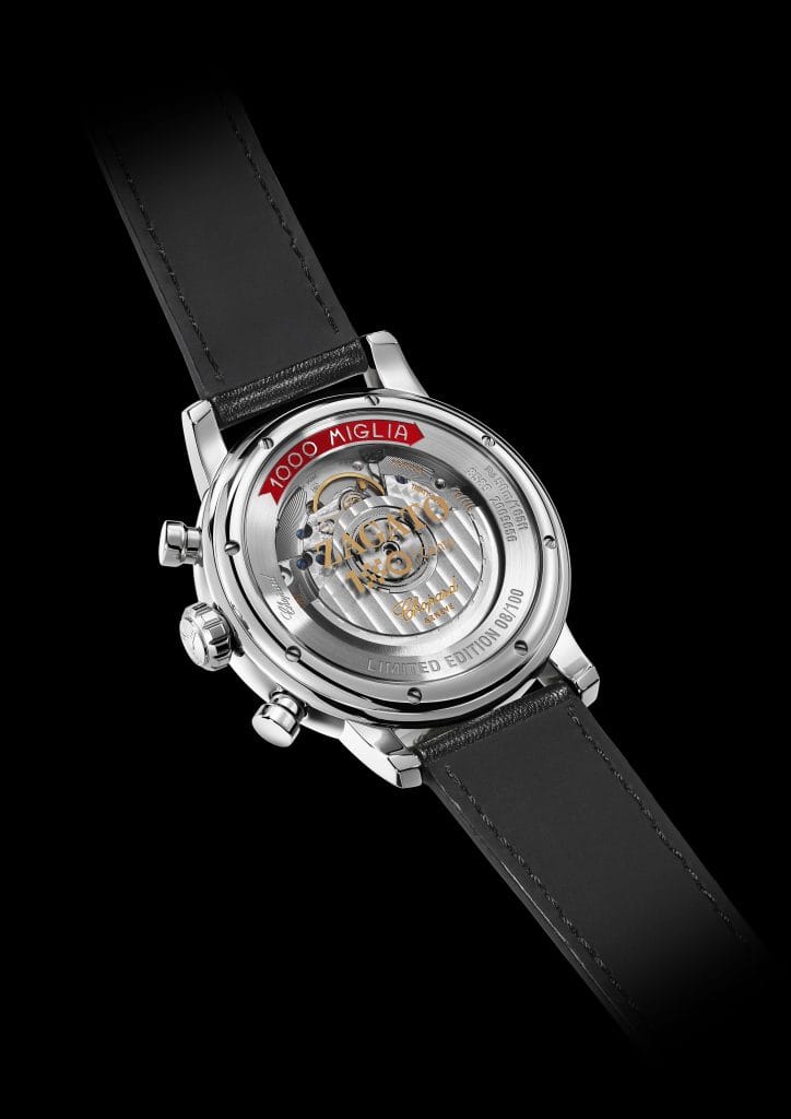 Inutile de dire que Chopard ne pouvait laisser passer cette année 2019 sans relever le défi, celui de faire honneur aux 100 ans de Zagato avec un garde-temps en tous points mémorable. Les principales options se sont alors vite imposées. Cette Edition 100ème Anniversaire serait évidemment une montre Mille Miglia, modèle à classer dans la collection Classic Chronograph initiée en 2017 et portant les codes d’une pièce racing, dans l’esprit de cette course pour voitures classiques chère aux deux Maisons. On retrouve ainsi un esprit vintage parfaitement assumé dans cette pièce de 42 mm carrossée d’acier, aux courbes inspirées de ces irrésistibles « oldtimers ». La mécanique est irréprochable avec une fiabilité et une précision garantie par le Contrôle Officiel Suisse des Chronomètres (COSC).