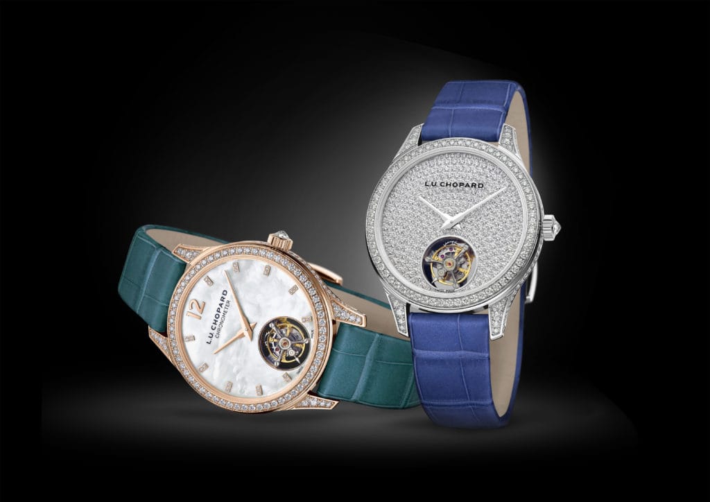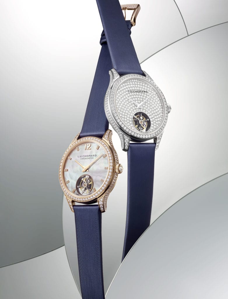 Les garde-temps L.U.C Flying T Twin Ladies ont beau contenir un mouvement d’exception, ils se distinguent d’abord par leur finesse et le raffinement de leurs cadrans. Avec un boîtier extra-plat de seulement 7,47 millimètres, façonné en or éthique rose 18 carats ou en platine et intégralement serti sur les flancs, les cornes, les entre-cornes, la couronne et la lunette, les nouveaux modèles L.U.C Flying T Twin Ladies affichent un diamètre de 35 millimètres. Des proportions harmonieuses, adaptées aux poignets des femmes, et qui font de ces deux créations les montres à tourbillon volant parmi les plus petites du marché.