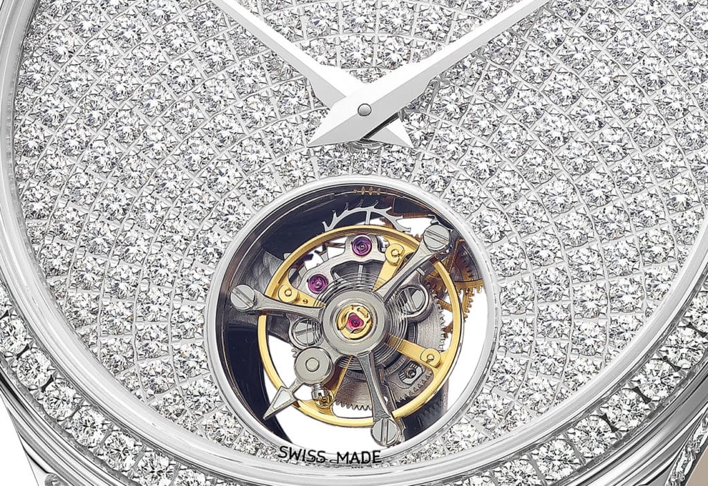 Dans sa version or, l’ouverture du tourbillon est pratiquée dans un cadran en nacre perlée, habillé d’index sertis de diamants taille brillant – sauf à midi, indiqué par des chiffres arabes dorés. Le cadran de la version en platine est, pour sa part, richement pavé de 282 diamants dont le sertissage est centré sur la cage de tourbillon.