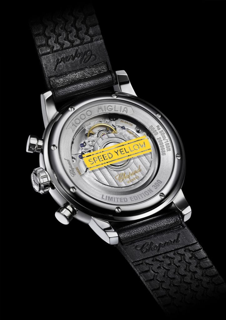 Ces Mille Miglia Racing Colours restent des chronographes de haute facture de 42 mm de diamètre assemblés par les maîtres horlogers de Chopard pour une série limitée à 300 pièces dans chaque couleur de cadran. Son calibre bat à 28 800 alternances par heure et est certifié par le COSC lui assurant une précision chronométrique durant les 42 heures de la réserve de marche. Les Mille Miglia Racing Colours sont inspirées des bolides ayant couru la Mille Miglia entre 1927 et 1940. Les cadrans affichent une lisibilité parfaite grâce à de larges chiffres arabes, luminescents dans la nuit, tout comme les aiguilles. Les typographies, cursives et fines, tout comme les compteurs, sont inspirés des tableaux de bords de la fin des années 1920 et se détachent grâce à leur couleur argentée. La trotteuse présente une extrémité rouge vif pour égrener les secondes précieuses de la course. Le logo Mille Miglia rouge en forme de flèche est apposé au cœur du cadran à 12 heures. Entre précision, confort et élégance, ces montres sont de véritables auxiliaires des pilotes lancés à pleine vitesse sur les routes transalpines leur permettant de courir avec style. Aux fonctions de chronographe, destinées à mesurer des temps courts, s’ajoutent le tachymètre, idéal pour mesurer les vitesses moyennes et le quantième de la date.