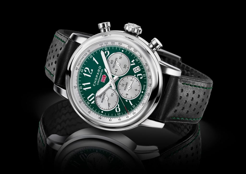 Ces Mille Miglia Racing Colours restent des chronographes de haute facture de 42 mm de diamètre assemblés par les maîtres horlogers de Chopard pour une série limitée à 300 pièces dans chaque couleur de cadran. Son calibre bat à 28 800 alternances par heure et est certifié par le COSC lui assurant une précision chronométrique durant les 42 heures de la réserve de marche. Les Mille Miglia Racing Colours sont inspirées des bolides ayant couru la Mille Miglia entre 1927 et 1940. Les cadrans affichent une lisibilité parfaite grâce à de larges chiffres arabes, luminescents dans la nuit, tout comme les aiguilles. Les typographies, cursives et fines, tout comme les compteurs, sont inspirés des tableaux de bords de la fin des années 1920 et se détachent grâce à leur couleur argentée. La trotteuse présente une extrémité rouge vif pour égrener les secondes précieuses de la course. Le logo Mille Miglia rouge en forme de flèche est apposé au cœur du cadran à 12 heures. Entre précision, confort et élégance, ces montres sont de véritables auxiliaires des pilotes lancés à pleine vitesse sur les routes transalpines leur permettant de courir avec style. Aux fonctions de chronographe, destinées à mesurer des temps courts, s’ajoutent le tachymètre, idéal pour mesurer les vitesses moyennes et le quantième de la date.