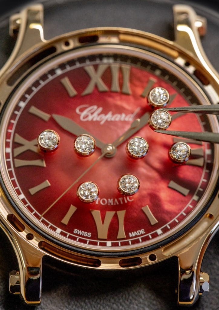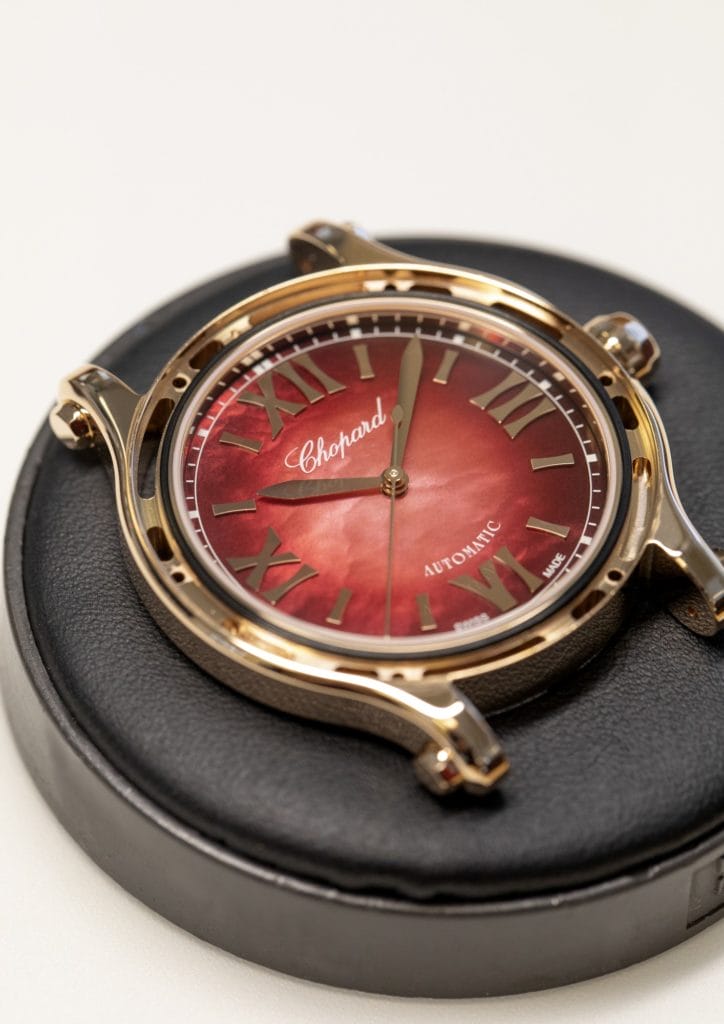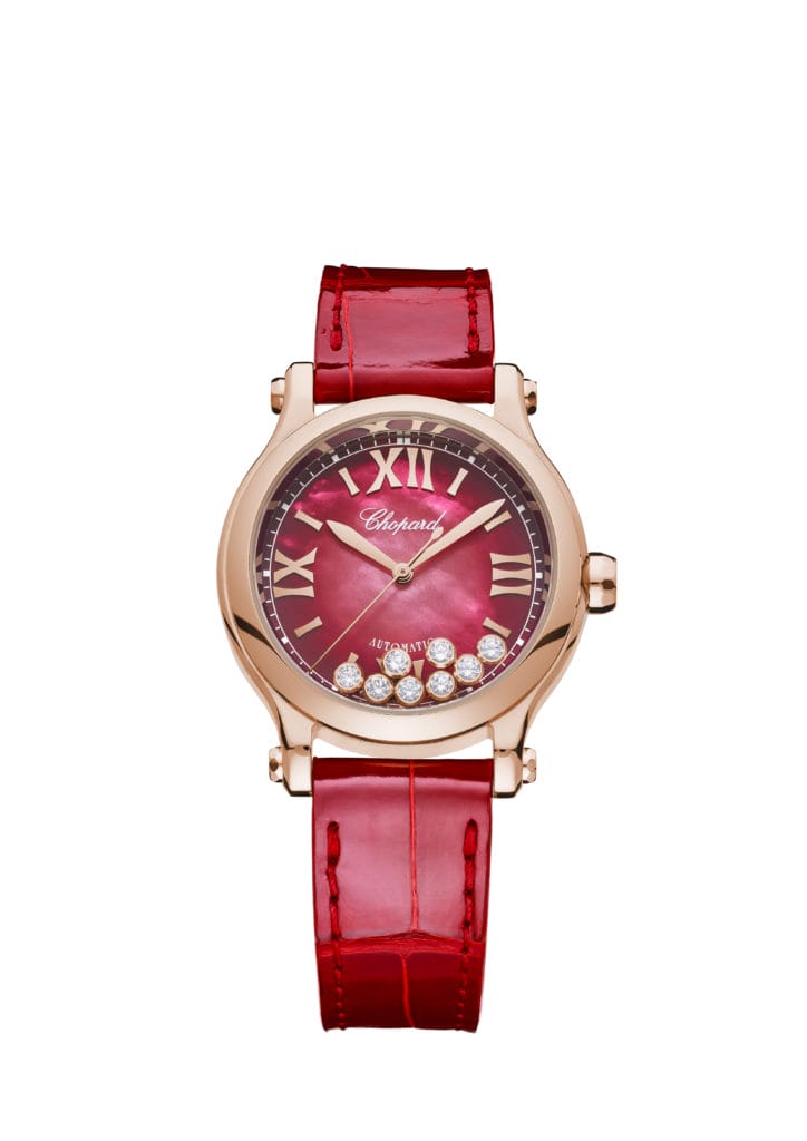 Les courbes idéales, la richesse et la puissance 8 font ainsi écho à la perfection des proportions de la Happy Sport, dont le boiter de 33mm de diamètre est inspiré par les règles du nombre d’or et dicté par la taille du mouvement Chopard 09.01-C qui équipe la collection. Une perfection formelle absolue, qui ouvre son théâtre carmin à une palette d’émotions en perpétuel mouvement. Et une devise, « Be happy », en guise de talisman !
