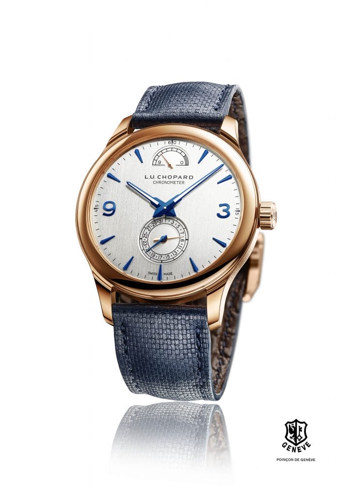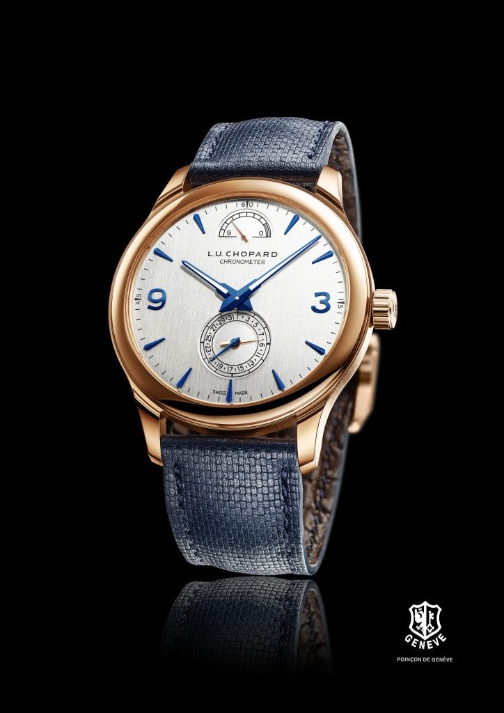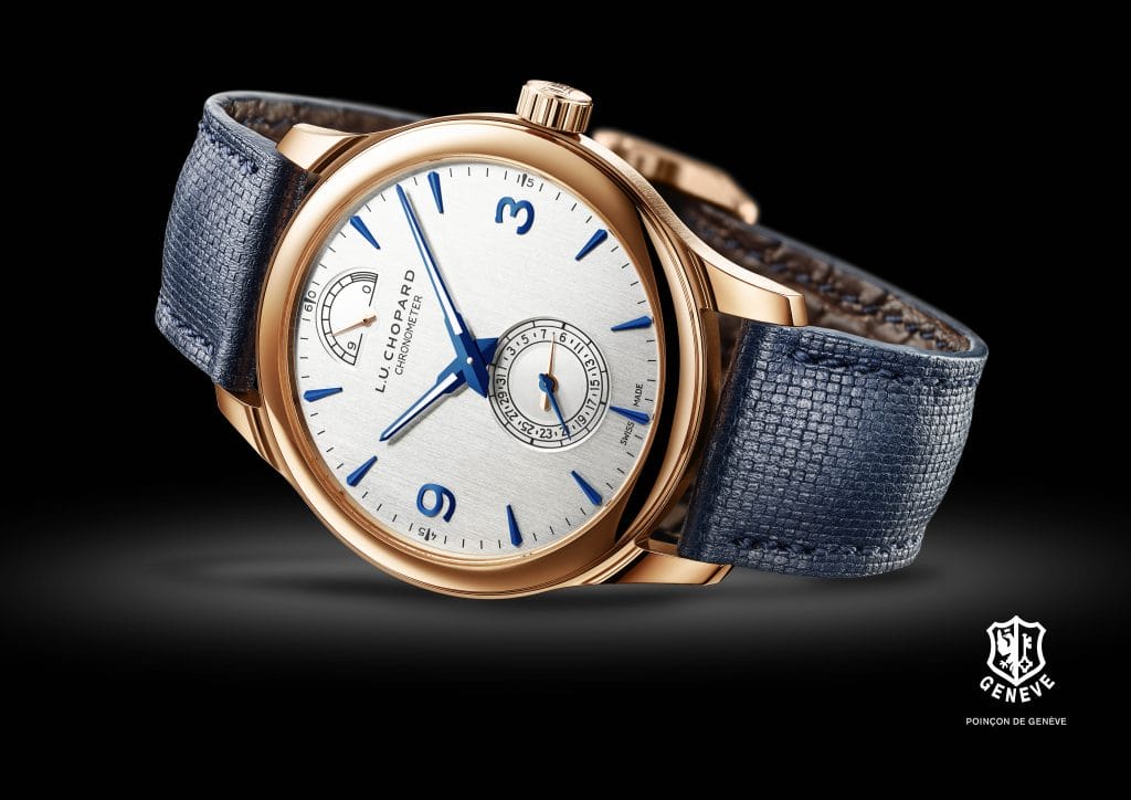 Cette version accueille à 6 heures un sous-cadran, signature de la L.U.C Quattro, qui contient à la fois la petite seconde et l’indication de date à aiguille. Ses graduations ont été affinées et simplifiées. A midi, l’indicateur de réserve de marche gradué jusqu’à 9 lui répond. Lui aussi signature iconique de la L.U.C Quattro, il a la forme d’un éventail ouvert à 180 degrés. La minuterie est ponctuée de deux grands chiffres arabes, à 3 et 9 heures, et d’index en applique bleuis. Leur forme est une extrapolation des aiguilles dauphine-fusée, propres aux collections L.U.C, qui sont pour l’occasion garnies de SuperLumiNova.