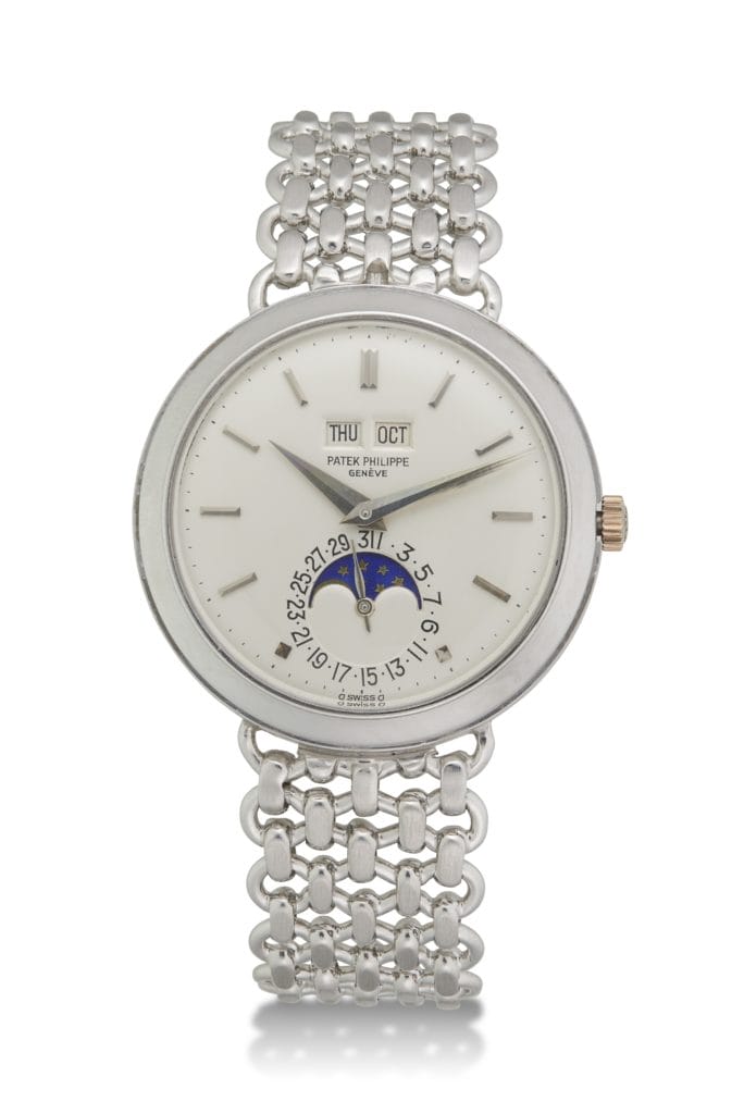 Présentée en 1962, la Patek Philippe quantième perpétuel en or blanc 18K, réf. 3448, a été la première montre-bracelet automatique à quantième perpétuel produite en série. Elle est l’incarnation parfaite d’une période de transition dans l’évolution du design horloger. Des boîtiers flamboyants et des cadrans multicolores des années 1920 et 1930 aux créations à tendance militaire et utilitaire des années 1940, une nouvelle tendance se dessine dans les années 1950 et 1960 : les avancées technologiques de l’époque inspirent, dans tous les domaines du design, des formes futuristes et un look plus sobre. Produite en 1974. Estimée entre USD 250’000 et USD 450’000.