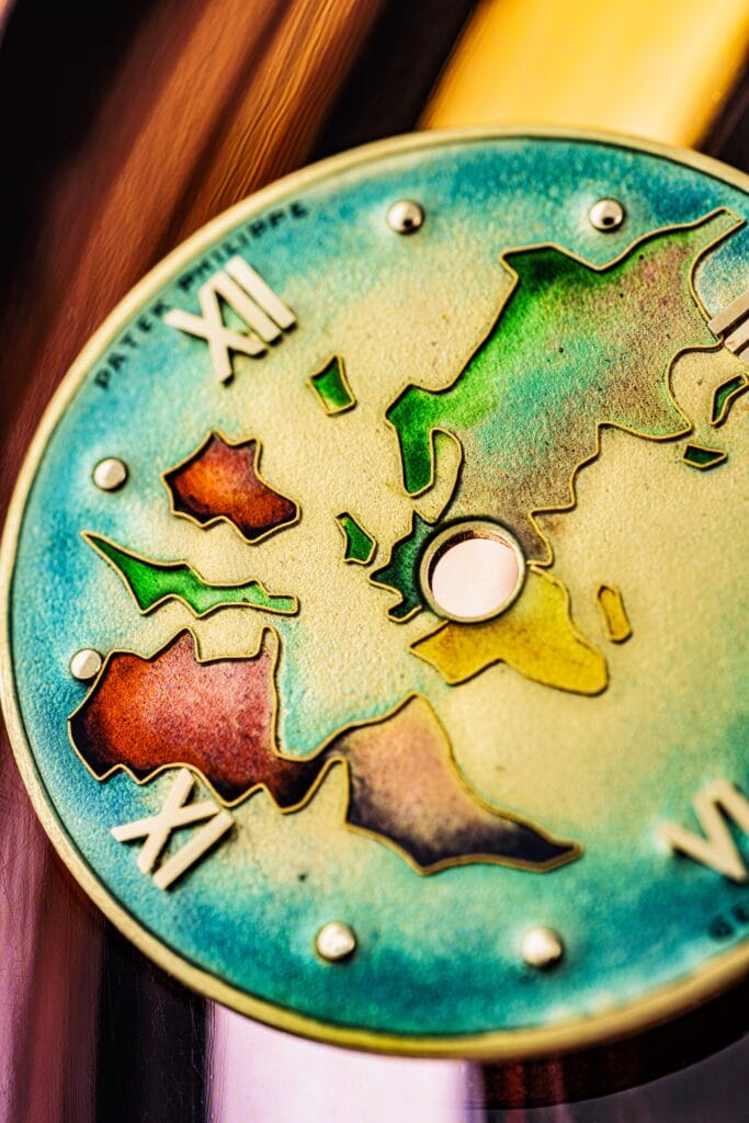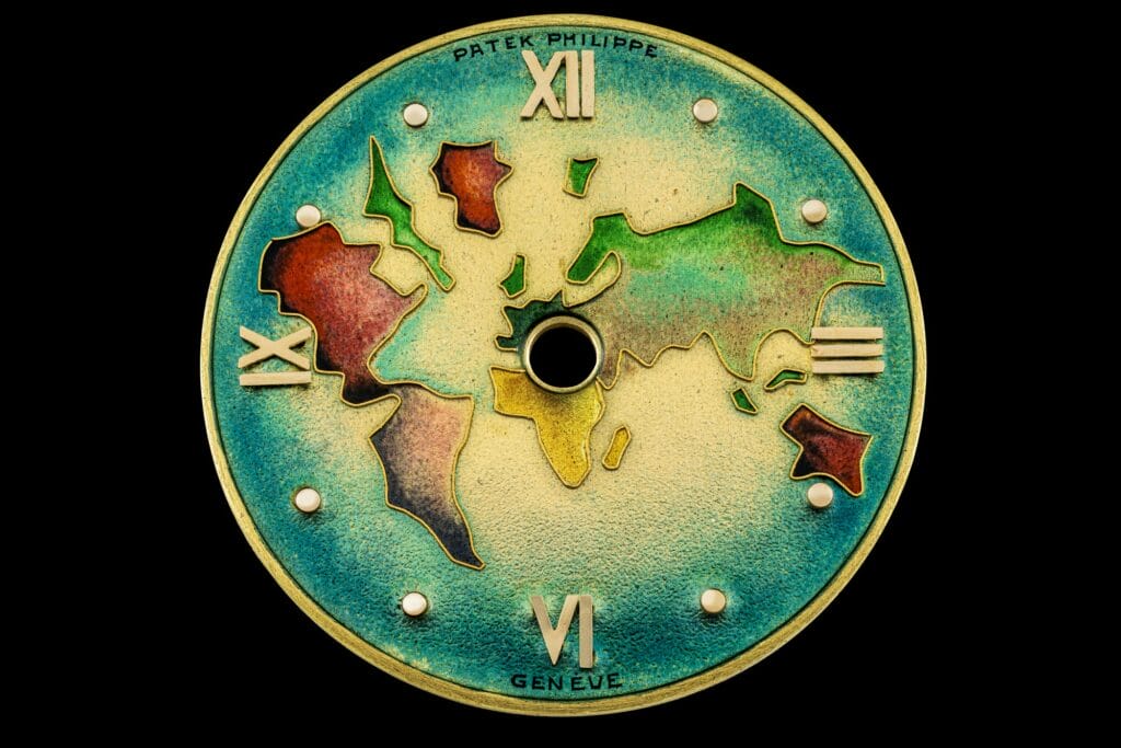 Fabriquée en 1948 et vendue en 1954, ce magnifique exemplaire de Haute Horlogerie, l’un des premiers à utiliser le système d’heures universelles de Louis Cottier, et créé sous la supervision directe de ce dernier, est présenté pour la première fois aux enchères. Parmi les 95 pièces produites par Louis Cottier et Patek Philippe de 1939 à 1964, seuls 3 exemplaires en or jaune, avec une carte émaillée représentant le globe terrestre entier, sont connus pour avoir survécu.