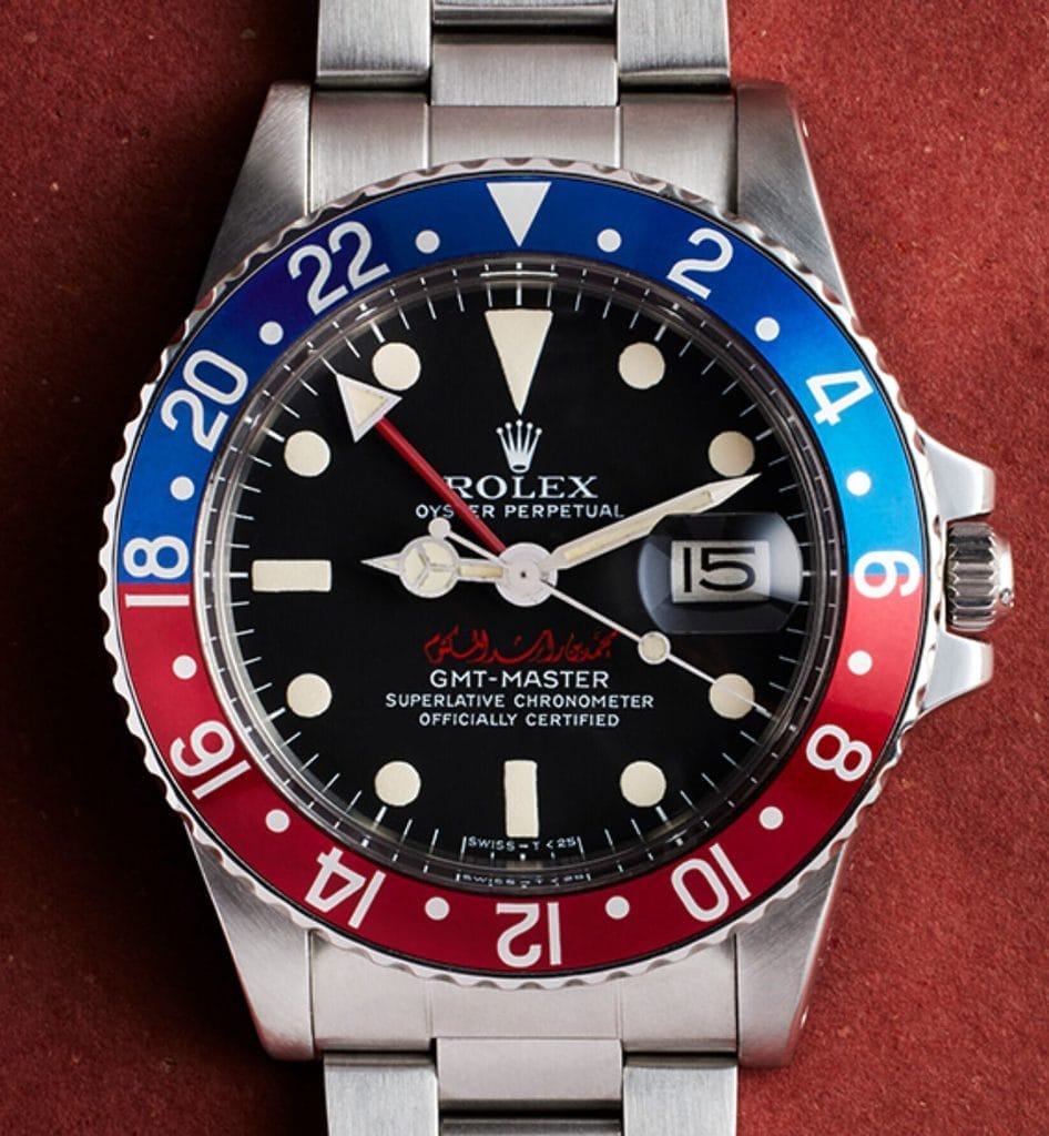 - Rolex GMT-Master 1675 : Cette pièce en acier inoxydable arbore la signature en arabe rouge de Sheikh Mohammed bin Rashid Al Maktoum, une montre personnalisée extrêmement rare datant de 1978 (estimation : 80 000 – 120 000 USD).