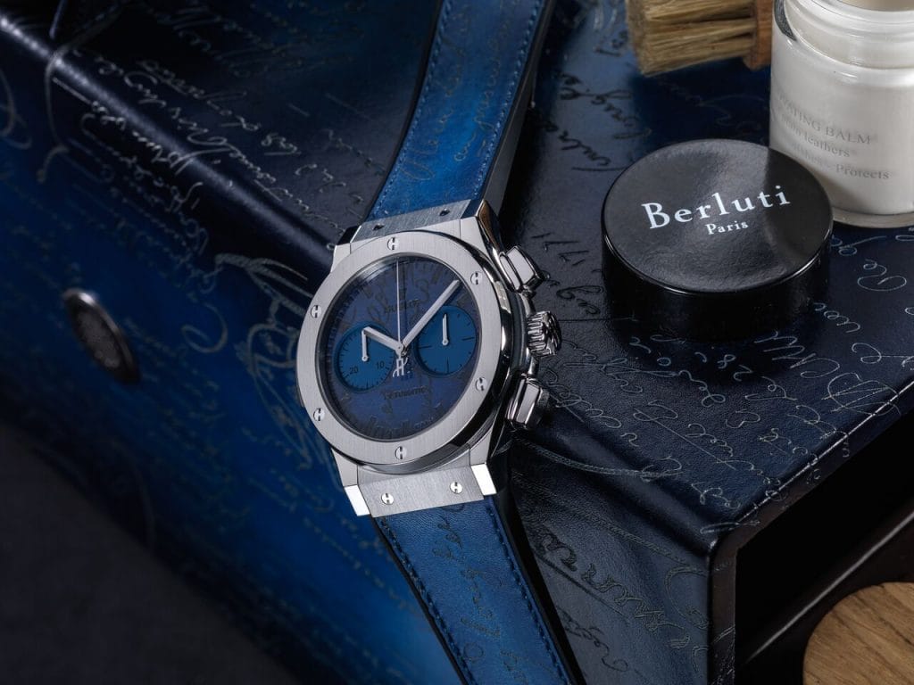 Cadran Cuir Venezia bleu authentique ou patine Berluti bordeaux avec décor Scritto et indices en relief, logo HUBLOT, mentions « Automatic » et « Swiss Made »