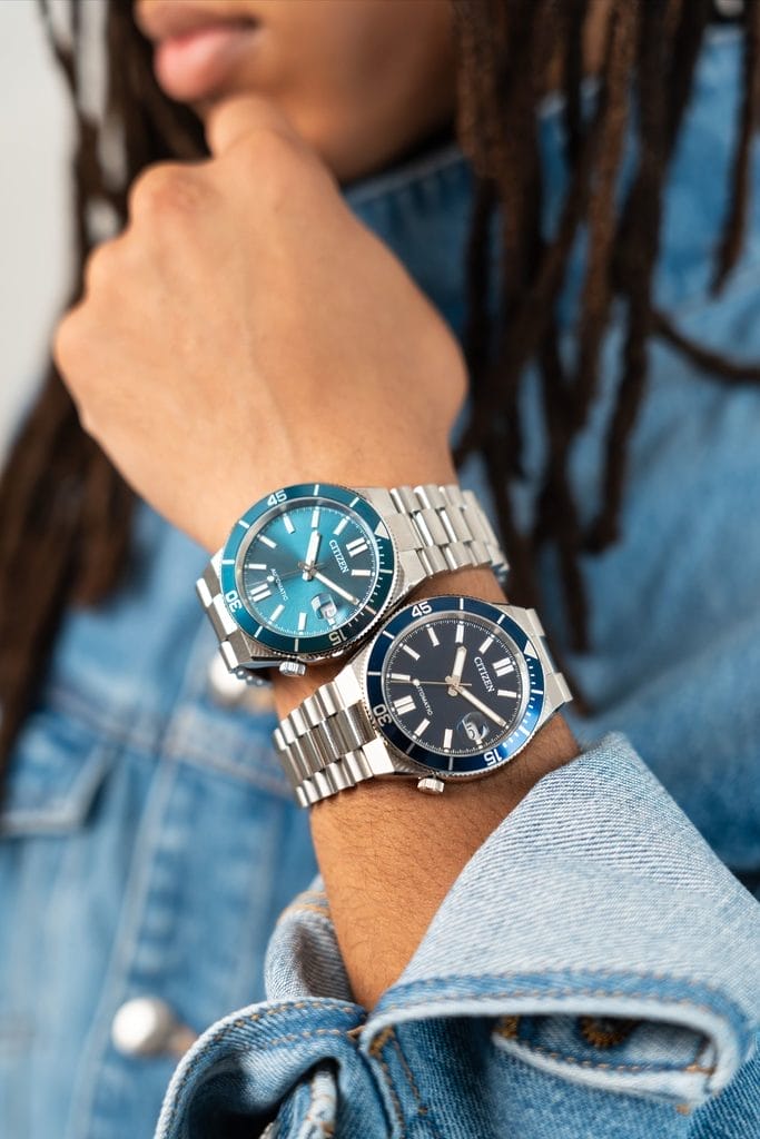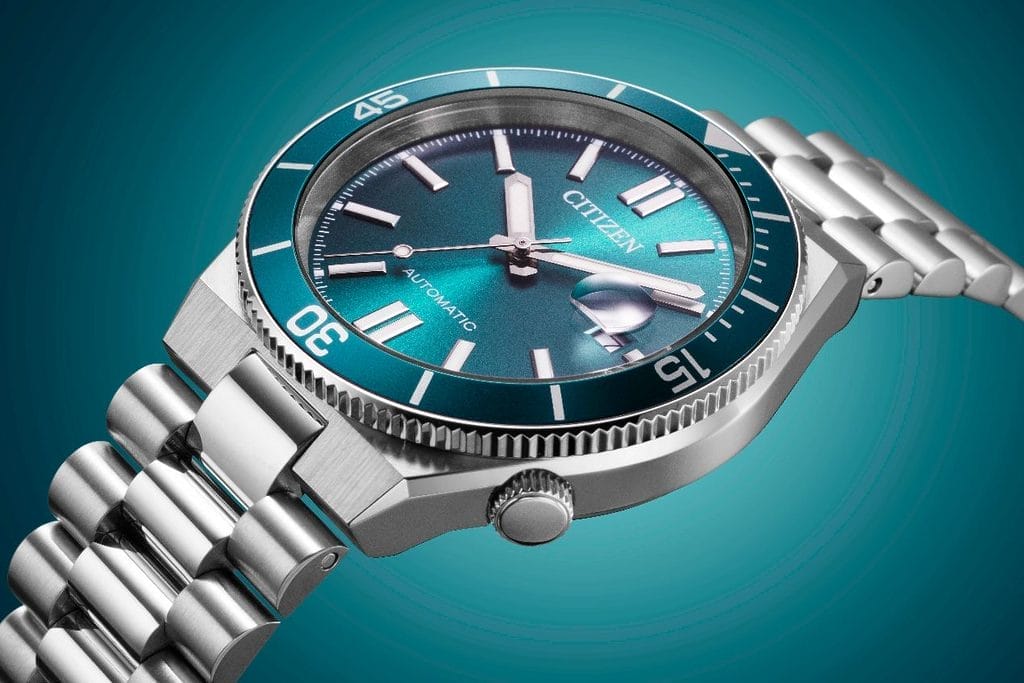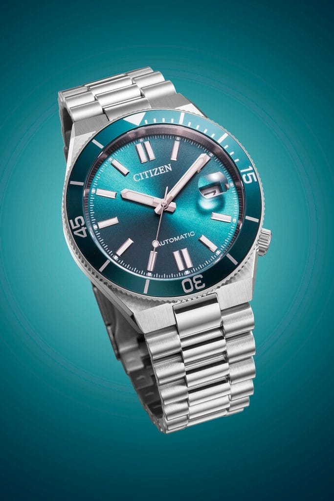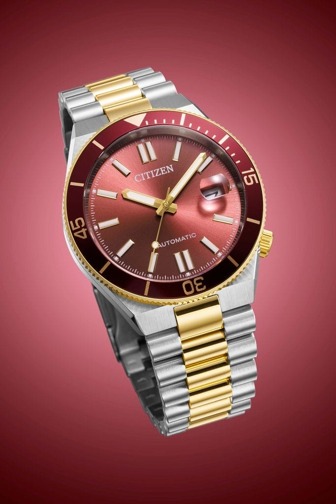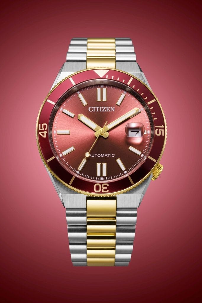Car la couleur est ici un élément central du discours. Citizen joue avec les nuances comme un peintre avec sa palette, puisant son inspiration dans les paysages marins. Bleu lagon, bleu marine, vert profond ou encore rouge bordeaux : chaque déclinaison évoque une atmosphère, un moment, une lumière. Deux versions en acier classique déclinent les bleus sous différentes intensités, tandis qu’une exécution dorée associée à un cadran vert profond apporte une touche plus sophistiquée. Enfin, une version bicolore acier et doré, animée par un cadran rouge bordeaux, vient compléter l’ensemble avec une proposition plus audacieuse.
