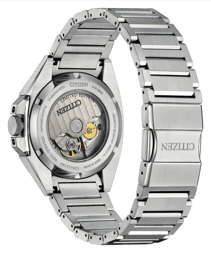 Au cœur de cette Series 8 bat le mouvement mécanique Calibre 9051, visible à travers un fond de boîte transparent qui ravira les amateurs de belle mécanique. Ce calibre à remontage automatique et manuel incarne l’excellence technique de CITIZEN, avec une résistance magnétique supérieure permettant de préserver la précision même à proximité immédiate d’appareils électroniques du quotidien.
