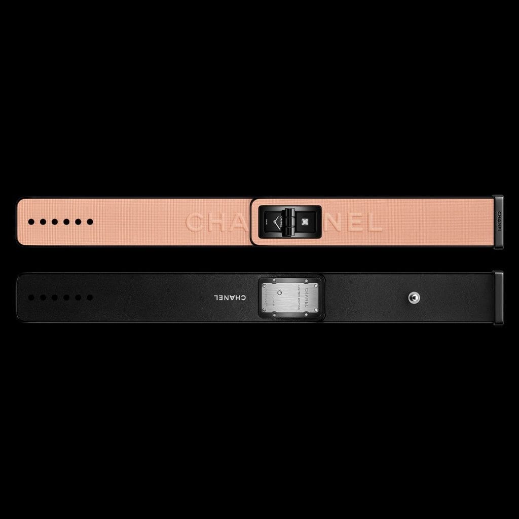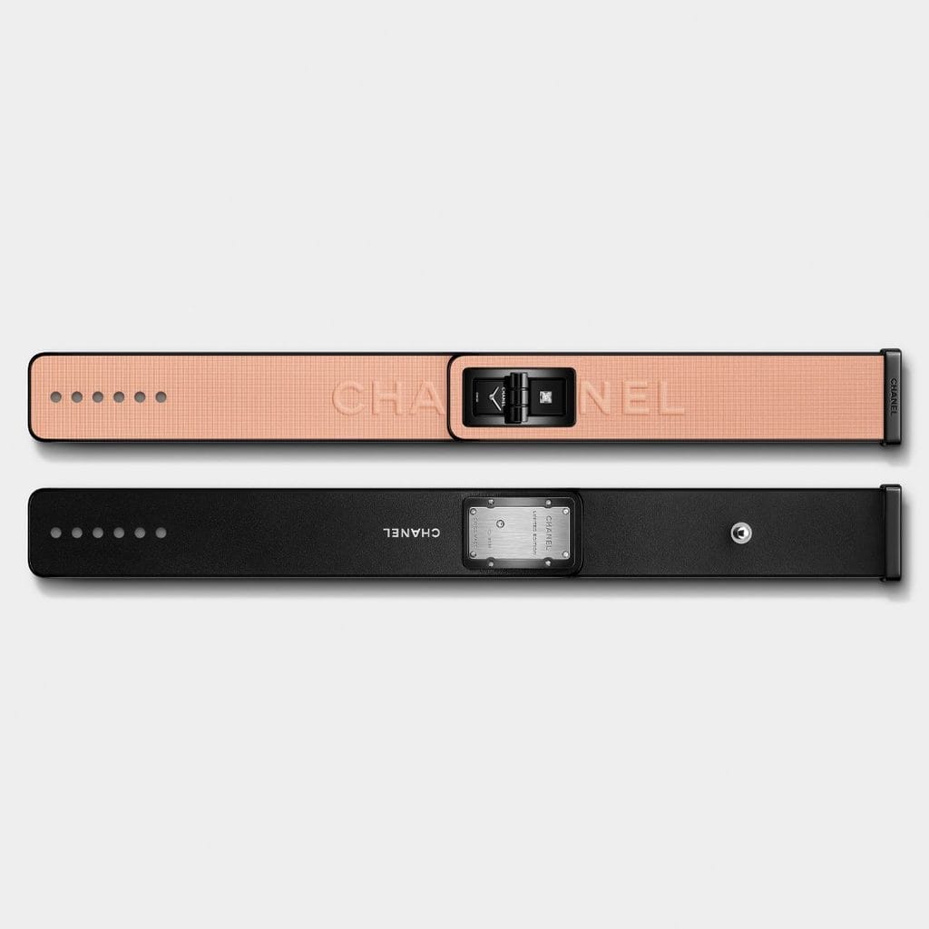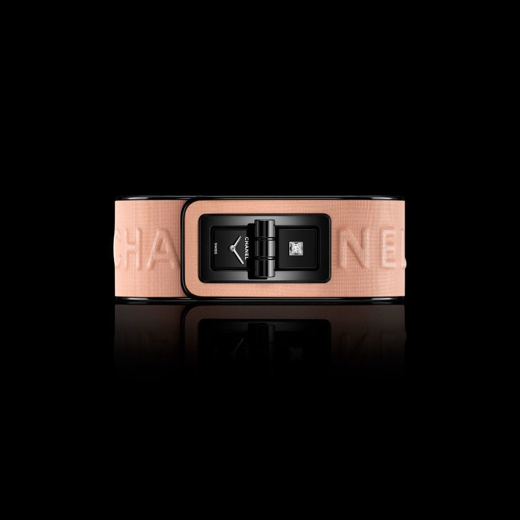 À la manière d’un fard appliqué au poignet, la montre Code Coco Blush se distingue par un bracelet en cuir de veau rose, embossé du logo CHANEL, irisé comme une poudre cosmétique, gansé de cuir noir verni. Ce contraste visuel renvoie directement aux écrins de maquillage des années 1920, noirs à l’extérieur, vibrants de teintes à l’intérieur. L’iconique fermoir Mademoiselle, hérité du sac 2.55, scelle la montre comme un bijou.