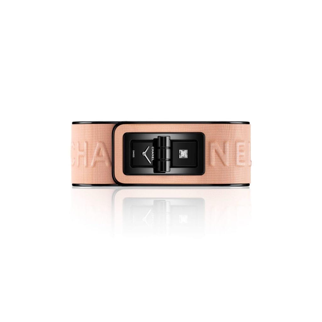 À la manière d’un fard appliqué au poignet, la montre Code Coco Blush se distingue par un bracelet en cuir de veau rose, embossé du logo CHANEL, irisé comme une poudre cosmétique, gansé de cuir noir verni. Ce contraste visuel renvoie directement aux écrins de maquillage des années 1920, noirs à l’extérieur, vibrants de teintes à l’intérieur. L’iconique fermoir Mademoiselle, hérité du sac 2.55, scelle la montre comme un bijou.
