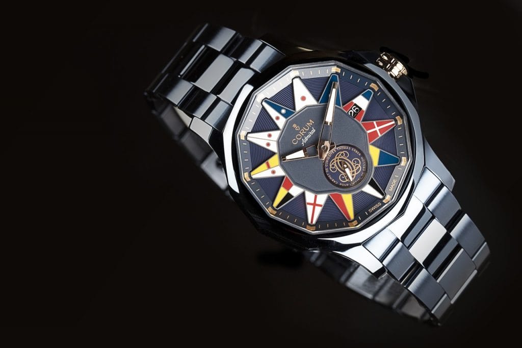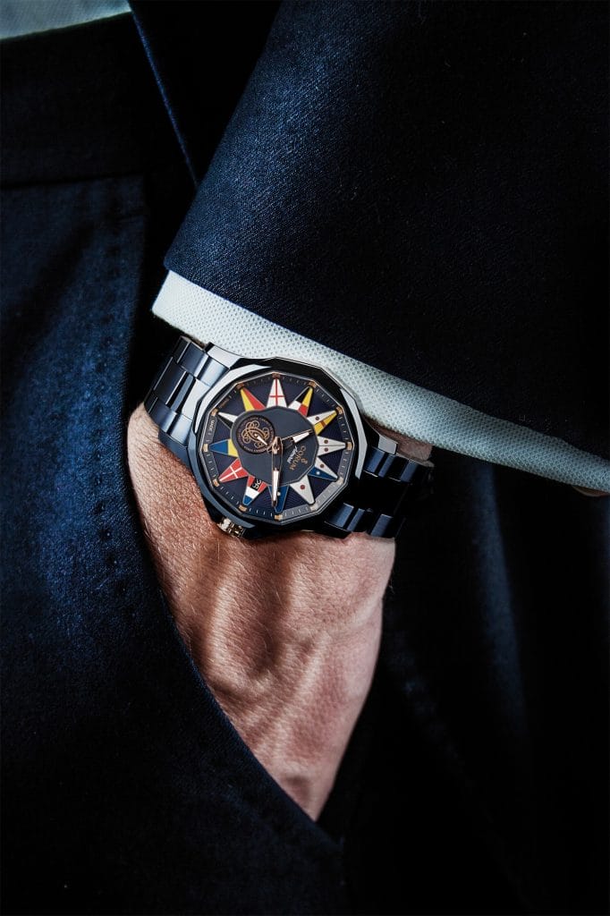 Aujourd’hui, la pièce est ornée des 12 fanions nautiques iconiques de l’Admiral, avec à 6h un monogramme composé du « C » du Hôtel de « Crillon », doublé pour évoquer directement le « Cabinet de Curiosités » de Thomas Erber. La pièce associe les tons bleu et or, présent sur la couronne et les aiguilles, pour rappeler la double vocation de la pièce, à la fois conçue pour la navigation et l’élégance des marinas et des palaces, comme l’Hôtel de Crillon.