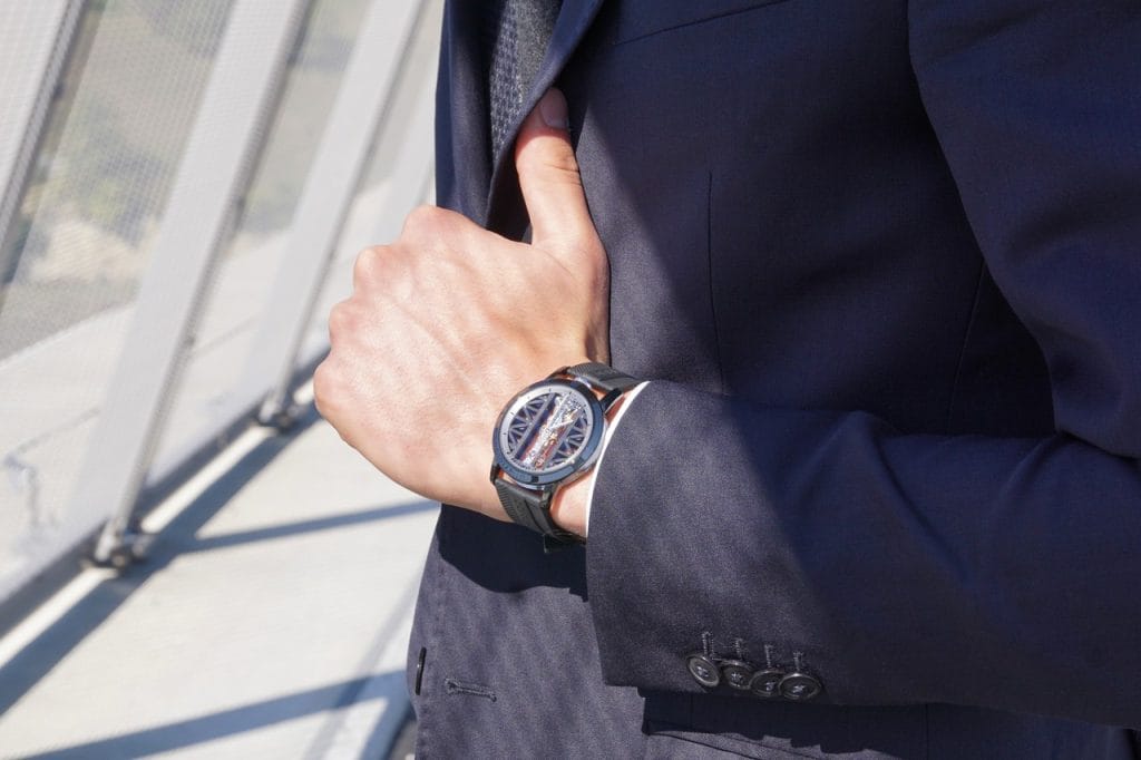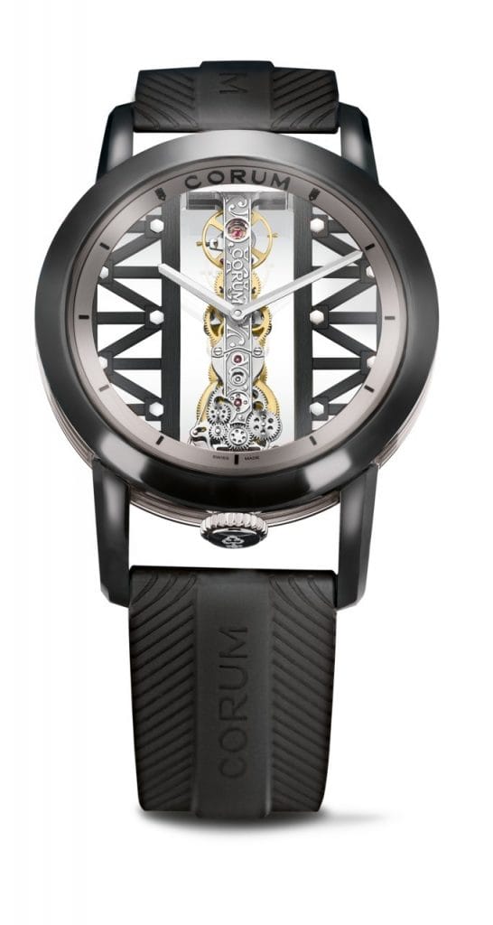Toujours aussi sculptural, le mouvement baguette prouve une fois de plus sa versatilité comme sa modernité. Il se complète ici d’une structure développée spécifiquement par Corum. Elle s’incarne en une géométrie de ponts croisés qui évoquent les plus beaux ouvrages d’arts du génie humain, aux premiers rangs desquels les ponts suspendus comme le Golden Gate ou le pont de Brooklyn. La cohérence est totale avec l’univers artistique de Corum, son ancrage à La Chaux-de-Fonds (où naquit Le Corbusier), son attachement historique à l’art et sa capacité à s’affranchir des codes horlogers.