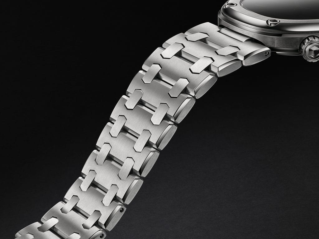 Les finitions alternent entre brossé et poli miroir, conférant un effet dynamique et une profondeur remarquable à la montre. Le bracelet, quant à lui, conserve son profil effilé et ses maillons hexagonaux, intégrant un poli miroir sur ses fines arêtes, fruit d’un savoir-faire artisanal minutieux.