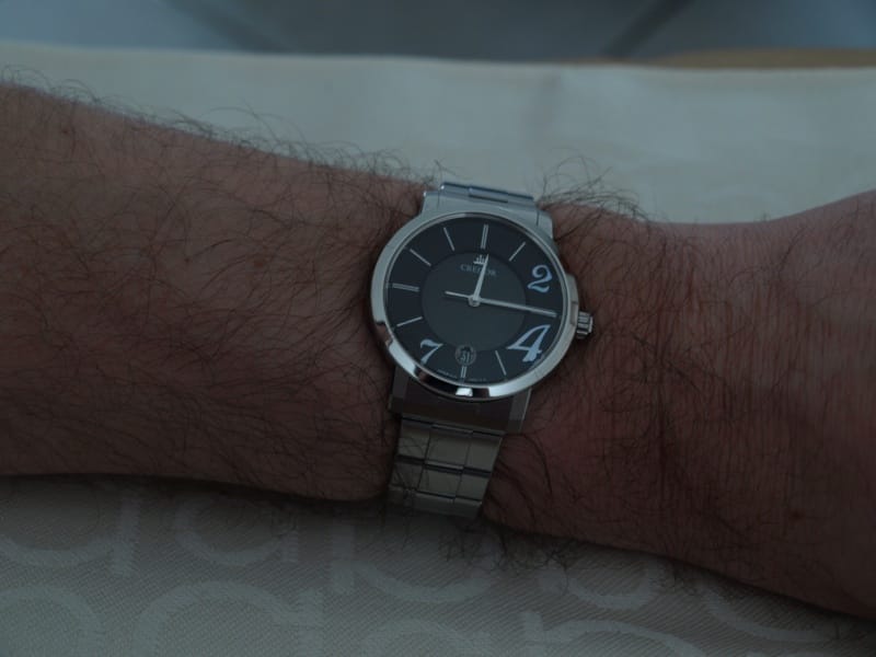 Une jolie petite Credor Node pouvait alors prendre assez logiquement sa place auprès de ses complices Seiko tout en offrant une alternative légère à la Moser en option montre habillée ou de soirée, la version acier permettant de rester dans des tarifs contenus en comparaison des modèles or. Voici donc la Belle, peu de temps après son acquisition : elle répond au doux nom catalogue de GCBW989 mais dans l’intimité je l’appelle plus volontiers « Credor grise nacre bleu » !