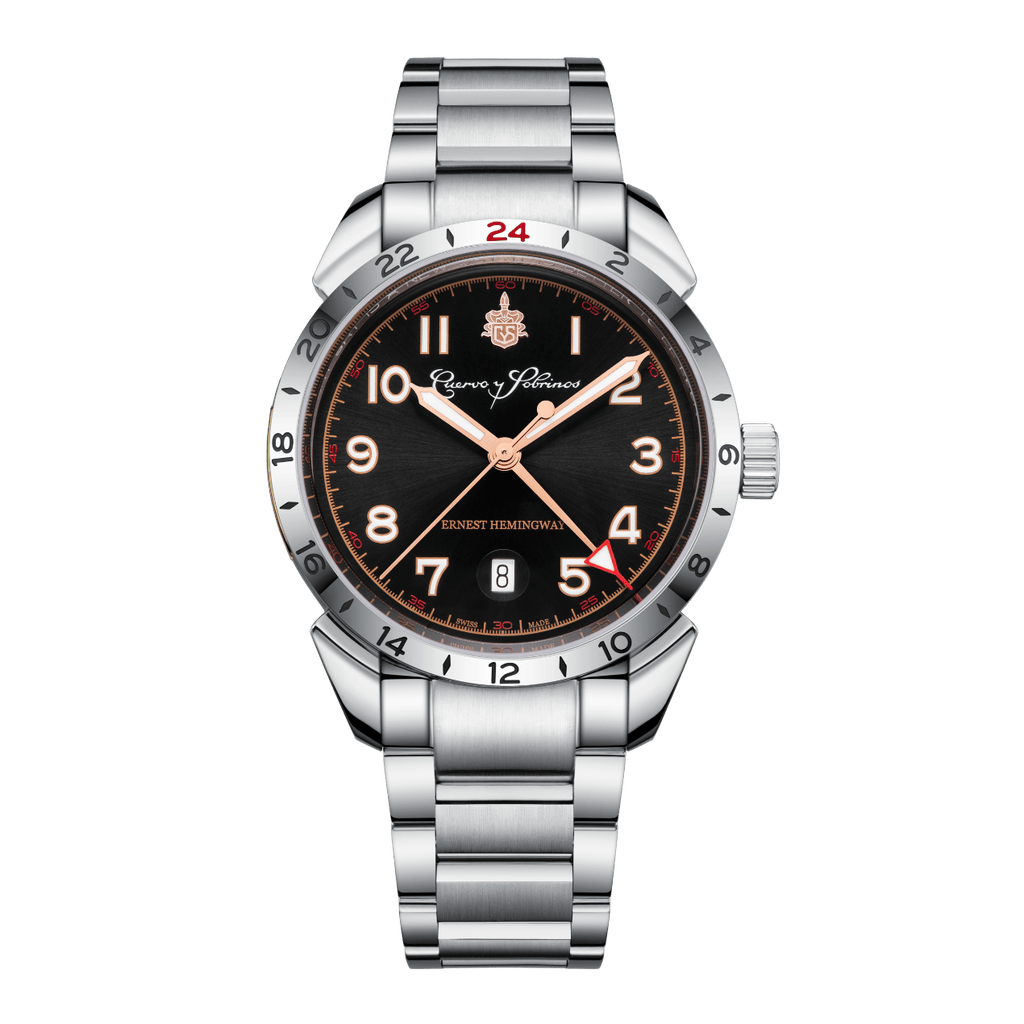 Le dernier-né de la collection Cuervo y Sobrinos, l’Historiador Hemingway Set, se compose de deux garde-temps minutieusement travaillés : un bicompax argenté et un modèle GMT noir. S’inspirant de l’esthétique vintage, l’équipe créative de Cuervo y Sobrinos a soigneusement sélectionné des teintes qui trouvent un écho auprès des connaisseurs en horlogerie, des collectionneurs et des fervents admirateurs du célèbre écrivain.