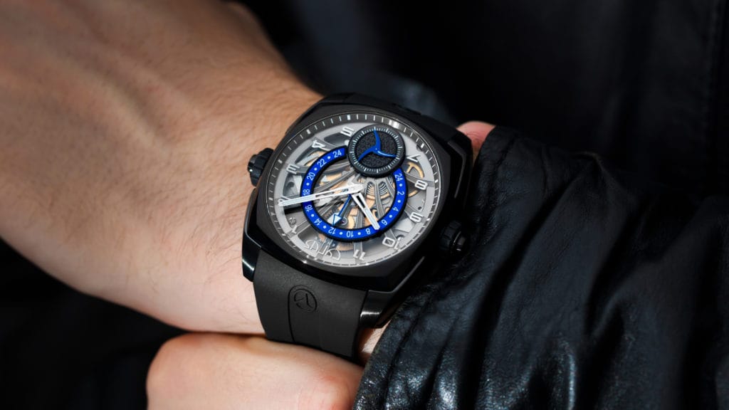 Conçu pour être un véritable garde-temps, fonctionnel, facile à utiliser et fidèle compagnon de nos aventures autour du globe, le nouveau KLEPCYS GMT RETROGRADE intègre tous les codes distinctifs de la marque, tant au niveau de la technologie de pointe que du style, futuriste et « non conventionnel ».