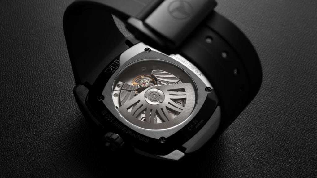 Grâce au fond en verre saphir, il est également possible d’admirer le travail minutieux des artisans qui ont décoré les ponts en gris anthracite NAC, avec des rayons légèrement incurvés, aux finitions satinées et microbillées. La masse oscillante monobloc est ajourée et reproduit le même style que la platine visible à travers le cadran.