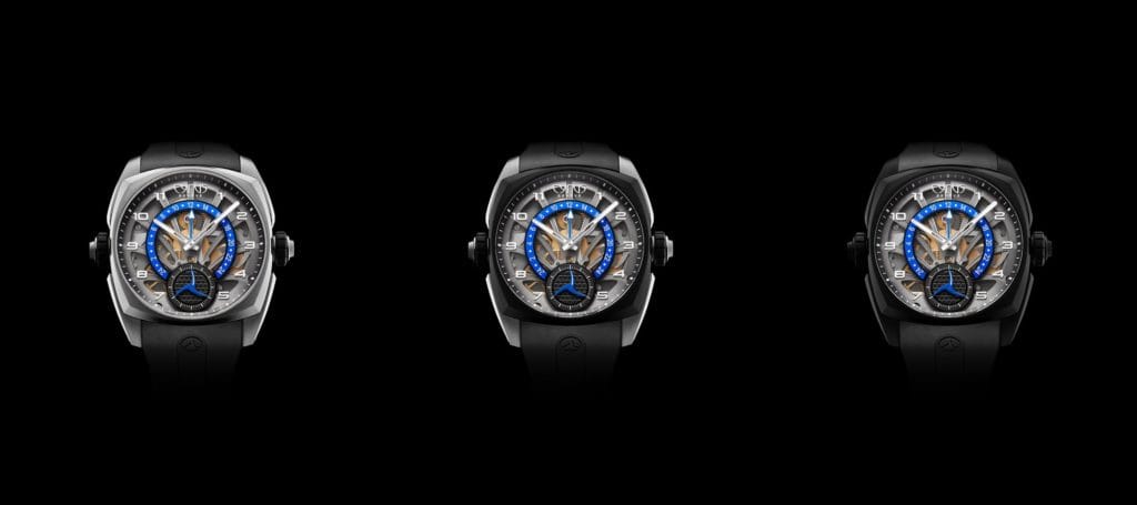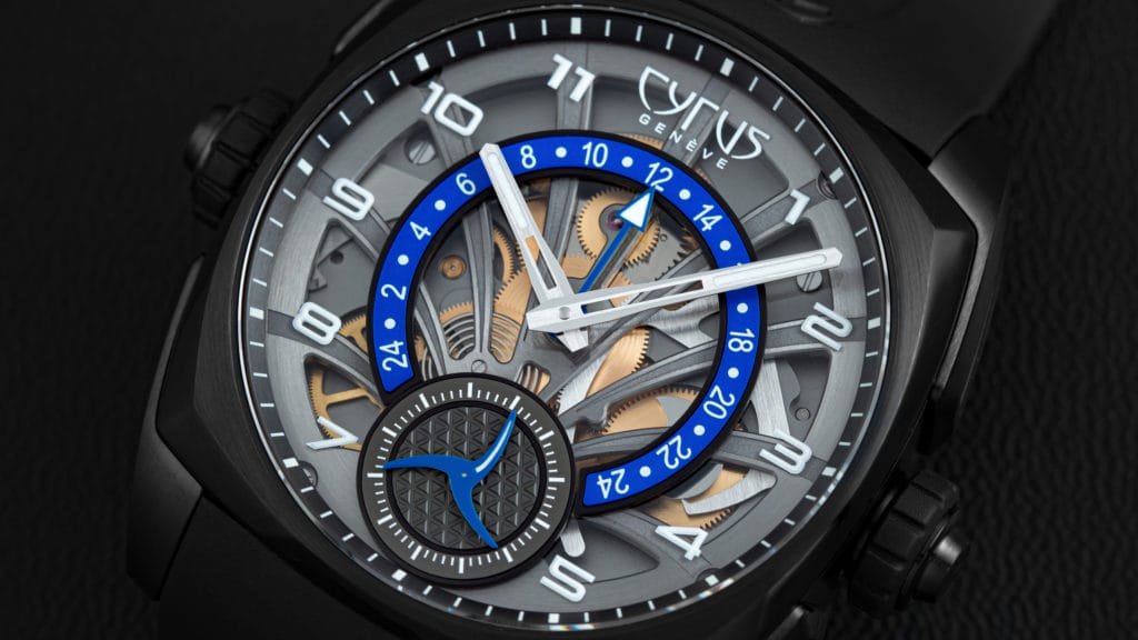 La star de ce deuxième cadran, orné du célèbre décor triangulaire gravé en relief avec traitement PVD noir, est l’hélice à trois bras de couleur bleue, symbole du logo Cyrus, permettant la lecture des secondes et dont une extrémité est luminescente.