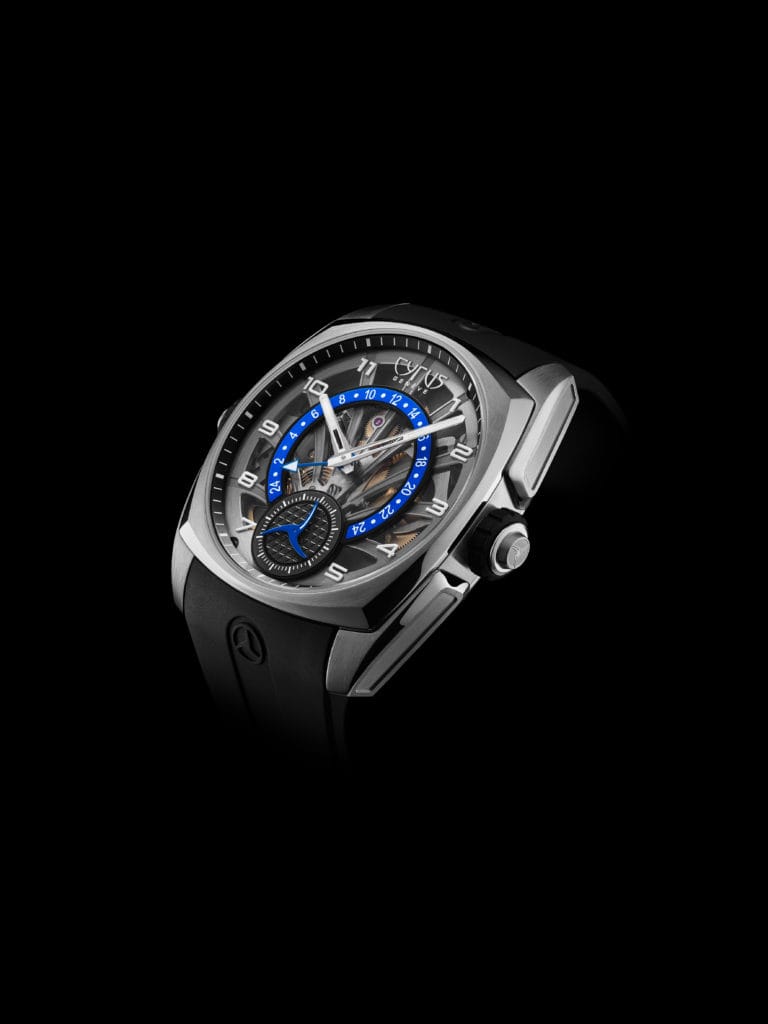 Lors de la conception, CYRUS a fait le choix de paramétrer l’heure locale comme heure principale, indiquée par les aiguilles rhodiées et perforées au design novateur.
