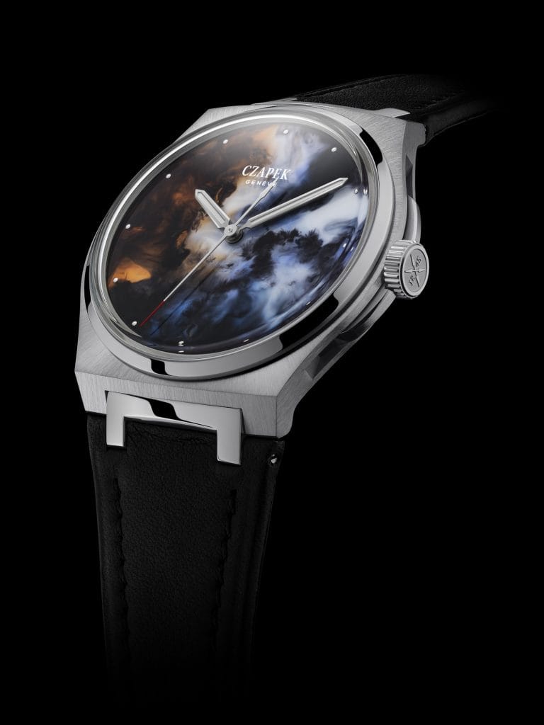 Il a été excentré afin d’offrir une vue plongeante sur tout le train de rouage tout en armant un seul barillet via le désormais traditionnel rochet ajouré Czapek, reconnaissable à ses cinq branches. En sus, le ressort-spiral plat optimisé du barillet confère une réserve de marche de 56 heures, chose particulièrement remarquable pour un micro-rotor. Enfin, une étanchéité de 120 mètres (12 ATM) permet aux plus sportifs de garder leur montre au poignet et ce même lors d’une nage prolongée.