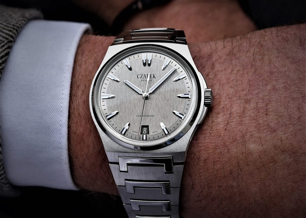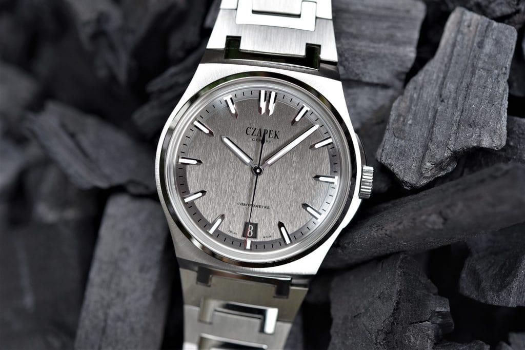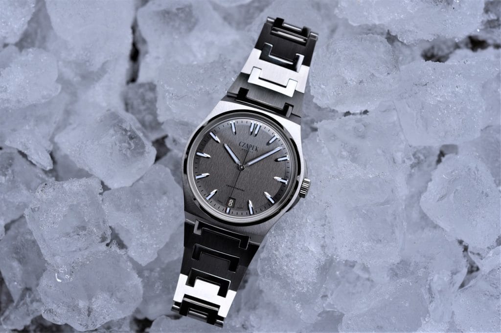 De tous les composant d’une montre, le cadran est, de facto, l’élément le plus visible d’une montre. Celui de l’Antarctique a été conçu et manufacturé par Metalem, un partenaire de longue date de Czapek & Cie. Sa conception se base sur une technique unique, appelée « Lamé », inventée il y a plus de 30 ans et encore améliorée pour l’occasion. Elle consiste à créer une série de traits sur le cadran à l’aide d’un peigne. Ces stries caractéristiques donnent ainsi aux couleurs plus de profondeur et accentuent plus que jamais la netteté des reflets. Sur ce motif artisanal, des index appliqués au design acéré viennent se poser, à l’image de ponts sur un océan. Quant au guichet de la date, il est positionné à 6 heures pour conserver une symétrie verticale typique de l’esthétique Czapek. Enfin des aiguilles glaive, à l’allure sportive, viennent compléter l’ensemble tout en assurant un confort de lecture maximale. Le boîtier en acier de 40.5 mm de diamètre et de 10.6mm de hauteur a été dessiné en intégrant deux courbes en « trompe l’œil », lui conférant à la fois une puissance et un équilibre visuel absolument unique. Le continuum de ce délicat équilibre est assuré par un bracelet ergonomique en acier brossé dont les liens polis miroir en forme de «C» de Czapek contrastent et soutiennent, comme en écho, la brillance de la lunette.