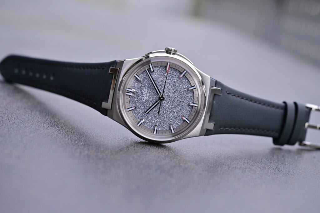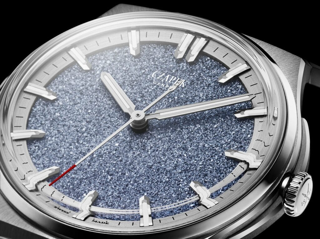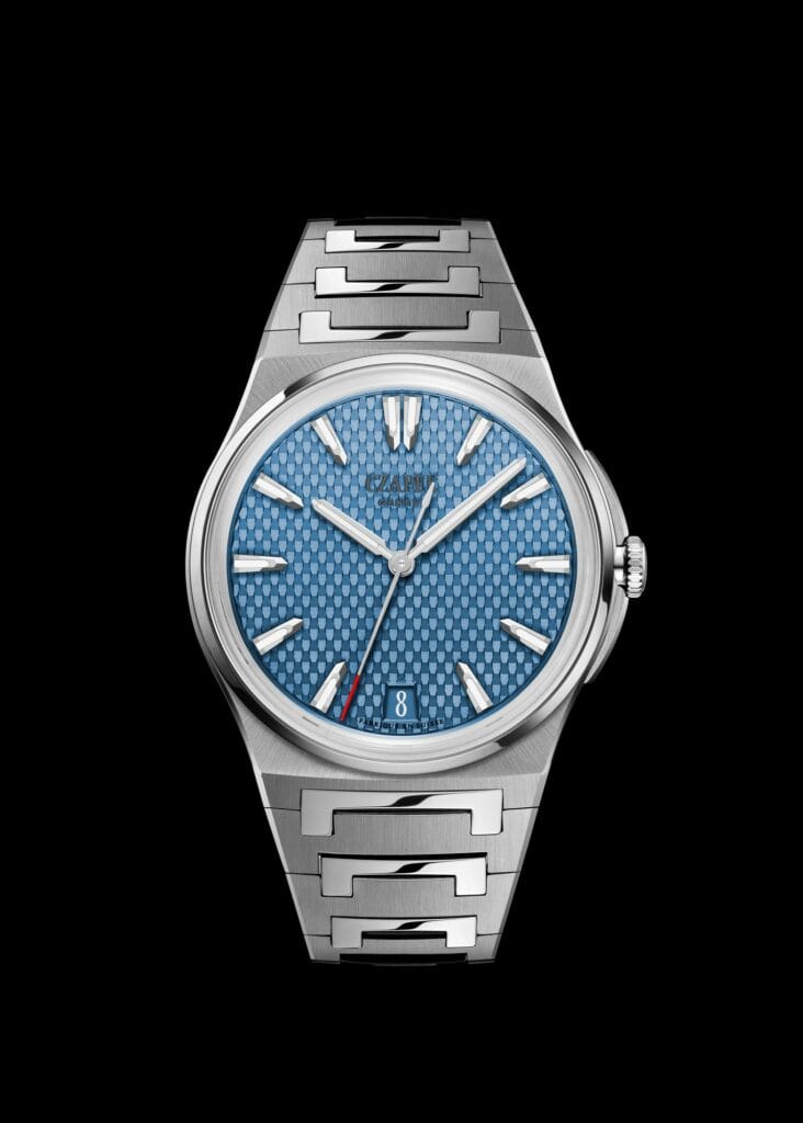 Cadran flinqué, motif trapézoïdal unique « Stairway to Eternity », officiellement enregistré – Couleur de cadran « Glacier Blue » réalisée grâce à un traitement PVD – Aiguilles glaive luminescentes en acier
