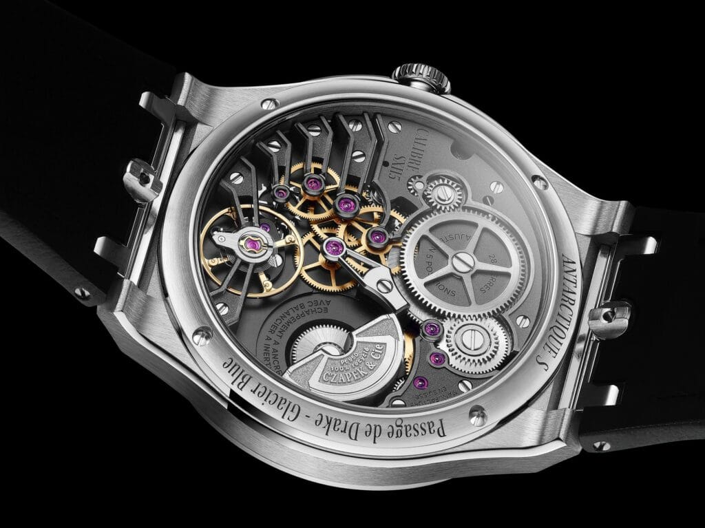 L’Antarctique S est animée par le Calibre SXH5, le premier mouvement entièrement conçu en interne par Czapek et introduit avec l’Antarctique Terre Adélie en mai 2020. Inspirée par les montres de poche de François Czapek du XIXe siècle, son architecture distinctive avec sept ponts squelettés est immédiatement reconnaissable. Tirant le meilleur du passé et du présent de l’horlogerie, elle est dotée d’un balancier à inertie libre et d’un micro-rotor élégant et très efficace en platine 950 recyclé. Les finitions de haute horlogerie combinent des angles rentrants biseautés à la main à une technique de gravure laser de pointe pour créer un magnifique jeu de contrastes : clair et foncé, texturé et lisse, mat et poli.