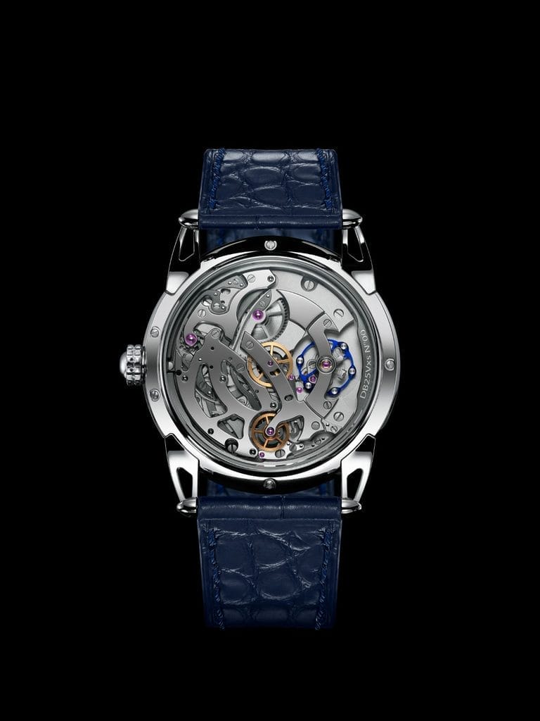 Visible à travers le fond du boîtier, l’architecture du mouvement dévoile des ponts en acier polis à la main ainsi qu’un travail de finition d’une extrême précision, reflet du savoir-faire des artisans horlogers de la manufacture.