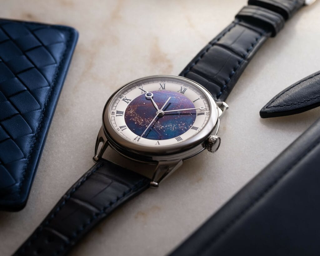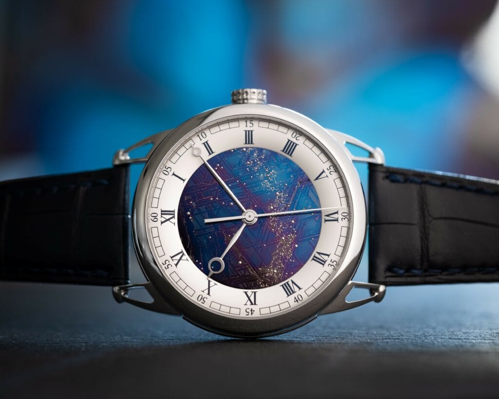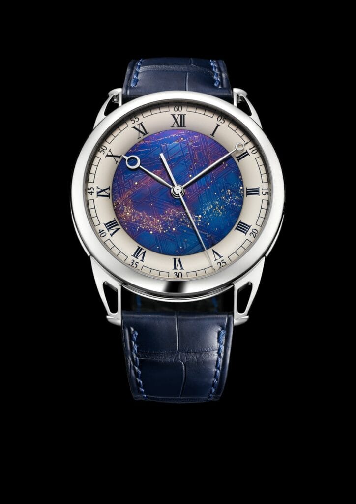 Grâce à sa maitrise dans l’art de l’oxydation thermique des métaux De Bethune élève le niveau de complexité en créant un ciel étoilé accompagné de sa voie lactée sur un cadran de météorite bleui au préalable. Un bleu qui résulte de la chaleur libérée par les réactions chimique de la météorite chauffée. De cette surface de cadran bleu, on devine une multitude de petites goupilles d’or gris qui ont été chassées une à une avec beaucoup de délicatesse entre les différentes formes et épaisseurs de ces structures géométriques octaédrites.