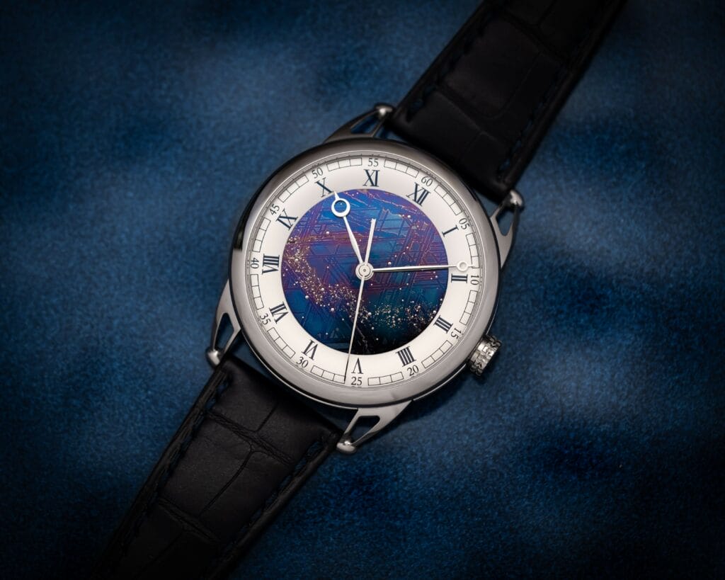 Grâce à sa maitrise dans l’art de l’oxydation thermique des métaux De Bethune élève le niveau de complexité en créant un ciel étoilé accompagné de sa voie lactée sur un cadran de météorite bleui au préalable. Un bleu qui résulte de la chaleur libérée par les réactions chimique de la météorite chauffée. De cette surface de cadran bleu, on devine une multitude de petites goupilles d’or gris qui ont été chassées une à une avec beaucoup de délicatesse entre les différentes formes et épaisseurs de ces structures géométriques octaédrites.
