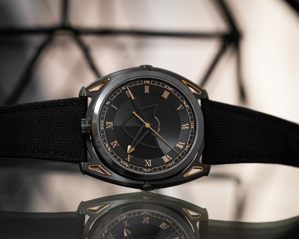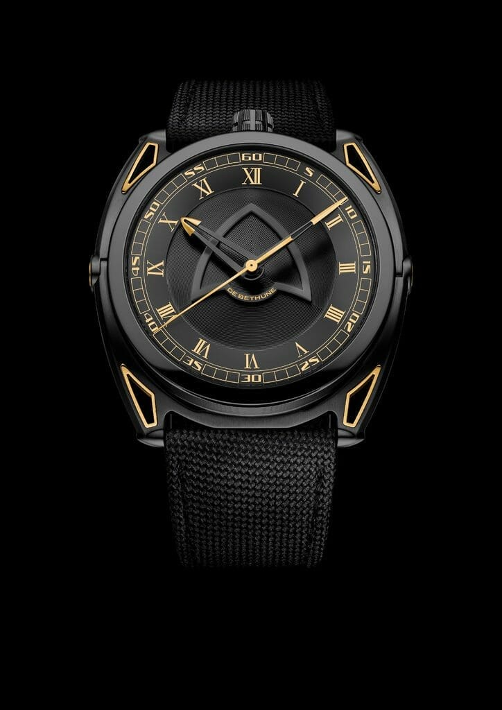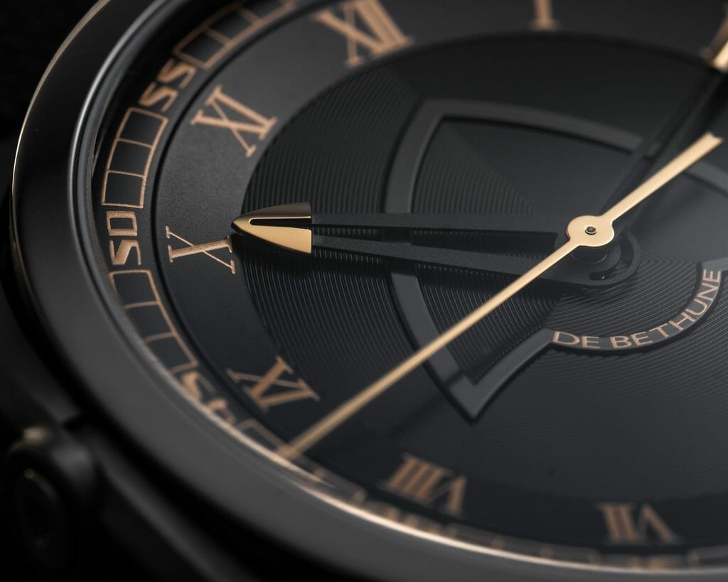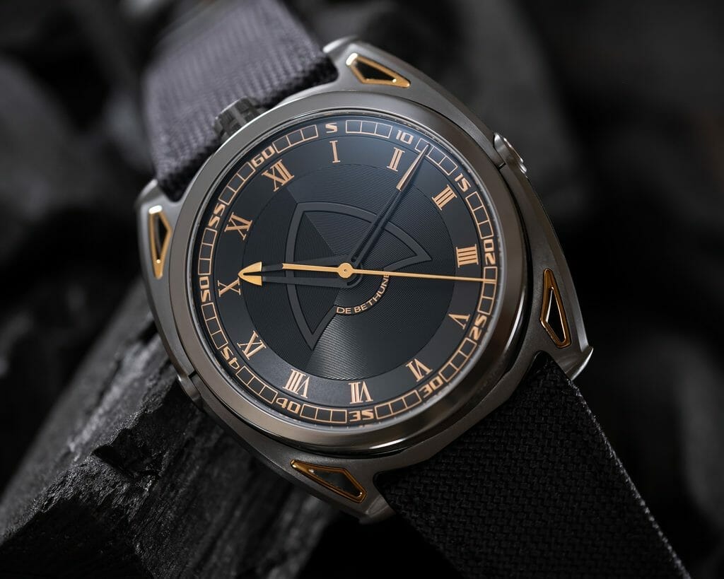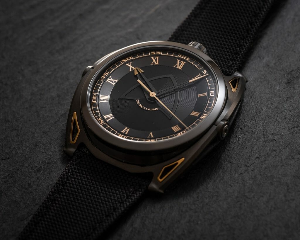 Travailler encore et toujours sur les nuances structurelles entre le gris foncé et le noir profond, en ajoutant avec parcimonie des touches dorées produites en réalité par du titane jaune… De Bethune a saisi l’opportunité de démontrer une nouvelle fois sa maîtrise du titane, de son oxydation et de sa palette de couleurs. Au bleu De Bethune, signature historique et pionnière de la marque, s’ajoute désormais une couleur or jaune issue d’un processus créatif qui a exigé de nouvelles techniques d’assemblage et de nouvelles compétences en matière de textures : Denis Flageollet et son équipe les ont développées pour mener à bien le projet et ainsi rendre hommage à cette formidable époque de découvertes high-tech.