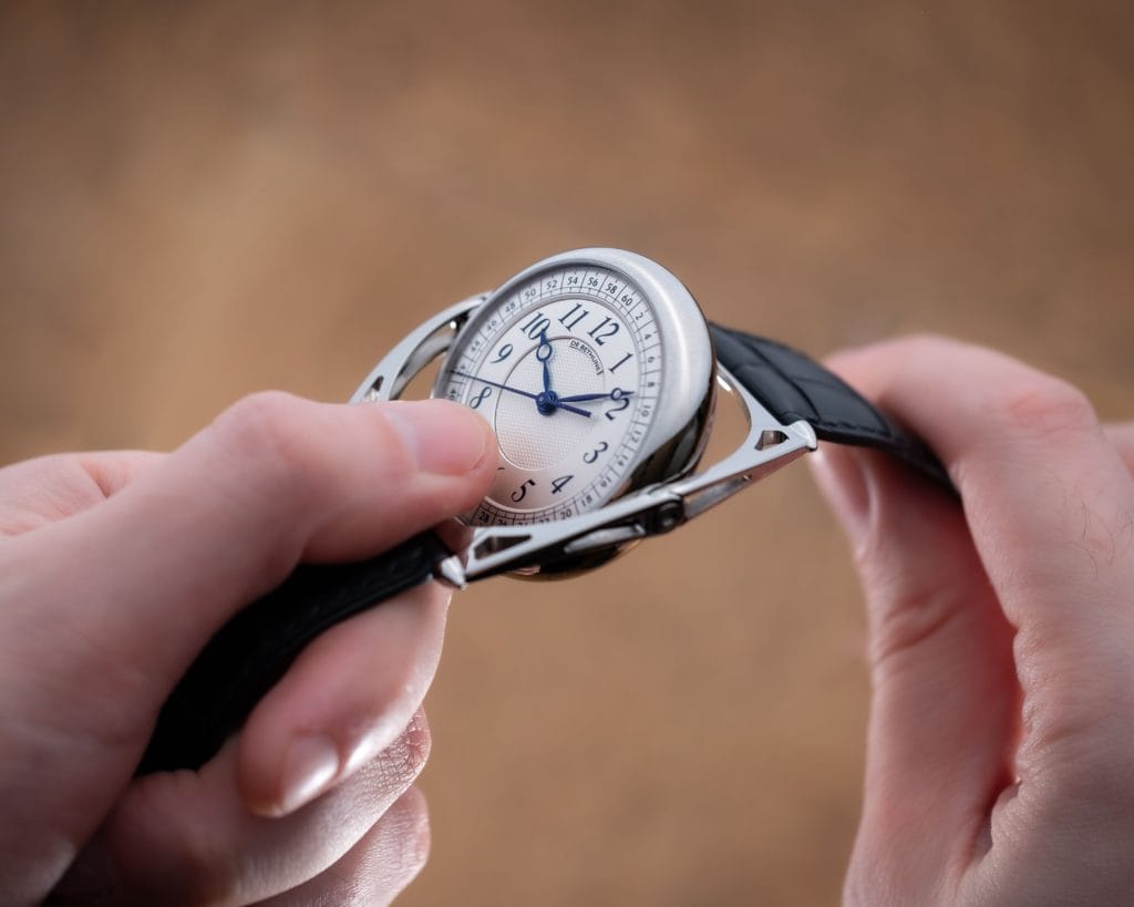 Grâce à une came, le petit « cran » permet de positionner instinctivement et parfaitement la boite de la montre dans l’alignement des berceaux. Tout en rondeur, la boite tourne sur son axe central et se met en place, recto ou verso, d’une manière si facile, fluide, complètement naturelle.