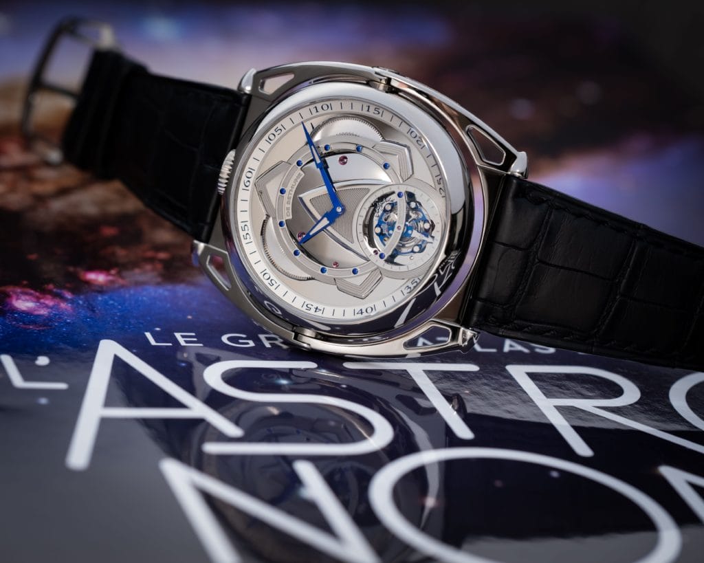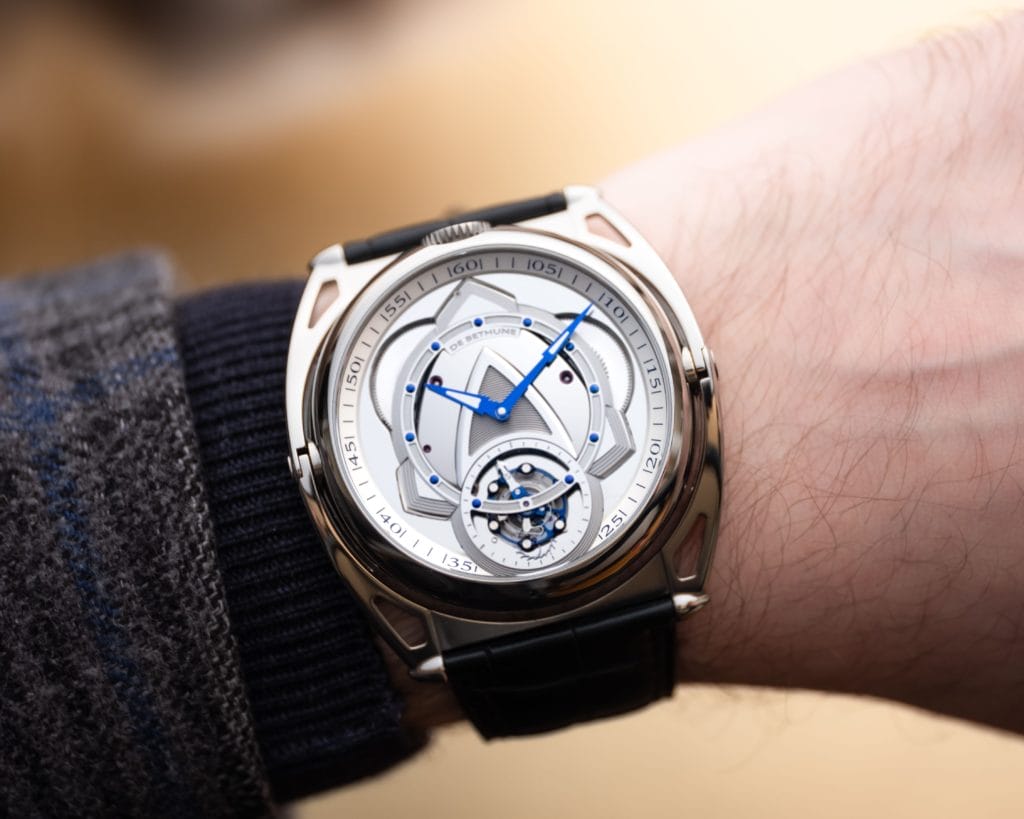 Sur l‘autre face, c’est un cadran à l’inspiration esthétique plus classique, arborant une partie centrale finement guillochée à la main, entourée des chiffres déjà présents historiquement chez De Bethune sur les cadrans des DB8 et DB10. Le tourbillon avec sa seconde a disparu. Ici les aiguilles des heures, des minutes, et plus surprenant des secondes sont positionnées toutes ensemble au centre. Un challenge technique tout en subtilité, pas forcément visible au premier coup d’œil, et c’est bien là, l’élégance de cette pièce.