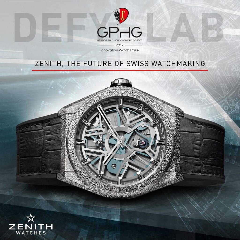 Le 8 novembre 2017 à Genève, devant un parterre de personnalités et de représentants de l’horlogerie suisse, le Grand Prix d’Horlogerie de Genève 2017 a dévoilé son palmarès : Zenith a reçu le Prix de l’Innovation pour sa Defy Lab. Belle récompense pour la montre la plus précise du monde, avec laquelle Zenith écrit son futur ainsi que celui de l’horlogerie suisse.