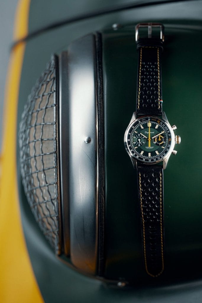 Pour permettre une lisibilité instantanée des indications, notamment lorsque l’on conduit, Depancel propose des sous-compteurs de couleurs différentes, homogènes avec les coloris des cadrans tout en jouant sur les effets de contrastes. Idéalement placé à trois heures, le compteur des minutes du chronographe est noir avec les indications jaunes, tandis que le compteur de petite seconde à neuf heures est de couleur ‘Vert anglais’ avec les marquages blancs. Ce chronographe, pensé pour les pilotes et les amoureux des sports mécaniques se présente dans un boîtier en acier inoxydable de 39 mm de diamètre.