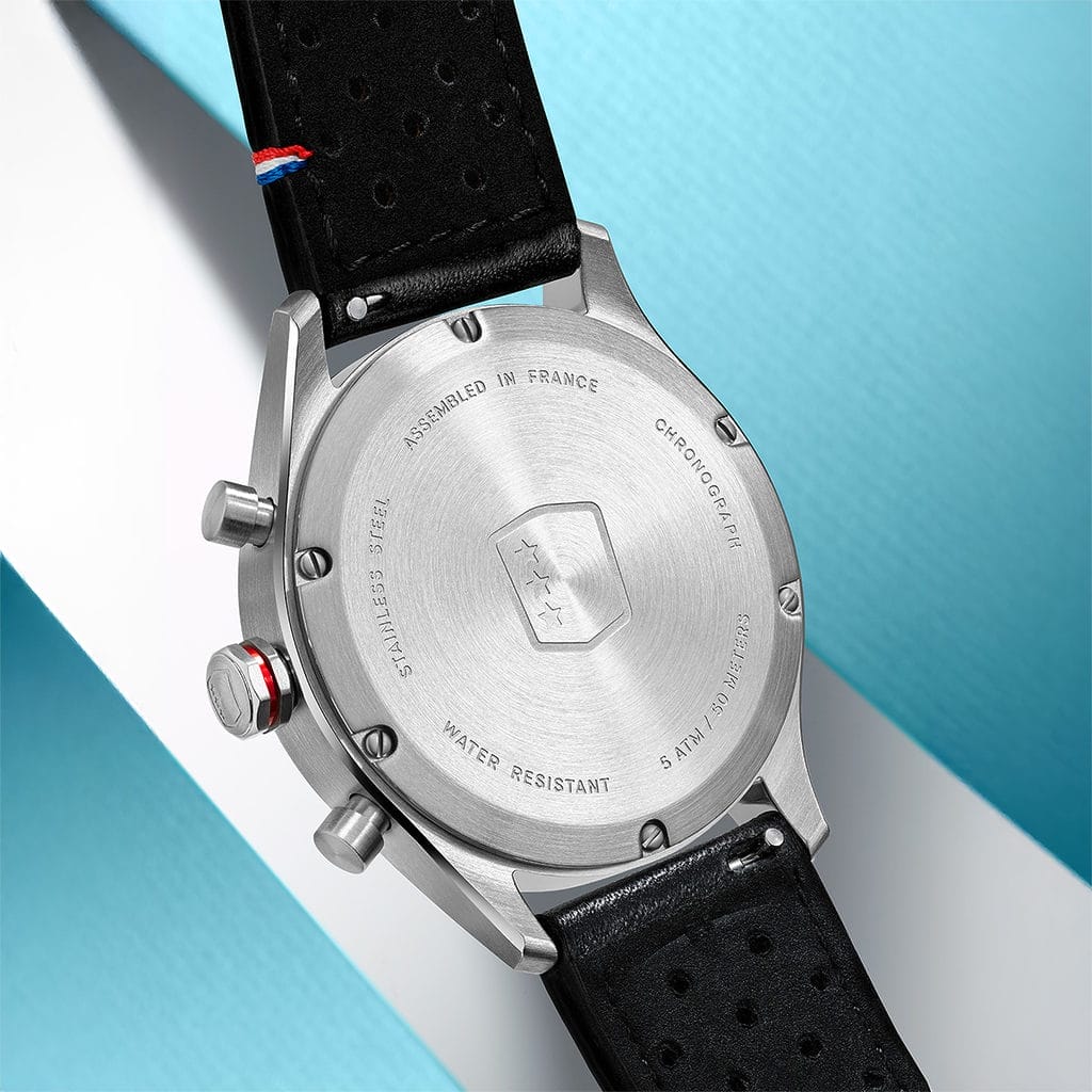 Le cœur de la montre est animé par le mouvement Seiko VK63, qui associe la précision du quartz à l’expérience d’un chronographe authentique. Il a été ajusté pour ne conserver que l’essentiel : heures, minutes, chronographe avec mesure des secondes et minutes. Un compagnon fiable et léger, idéal pour la saison estivale.