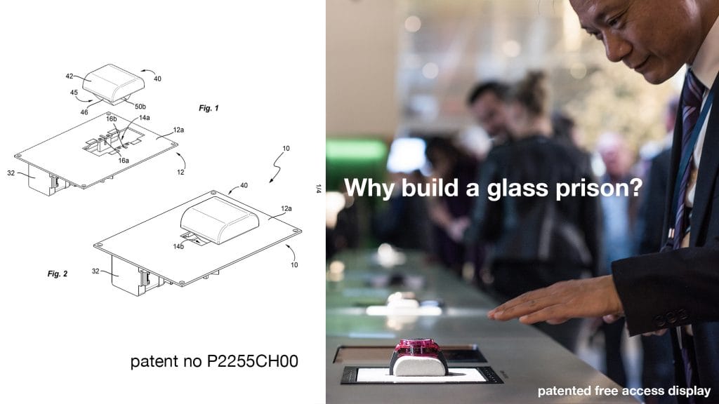 Après avoir déposé un brevet en 2018 (patent P2255CH00), ce système fait l’unanimité auprès de l’industrie horlogère et répond notamment à la jeune génération fortement dirigée vers l’open space et l’expérience produit. (apple store)