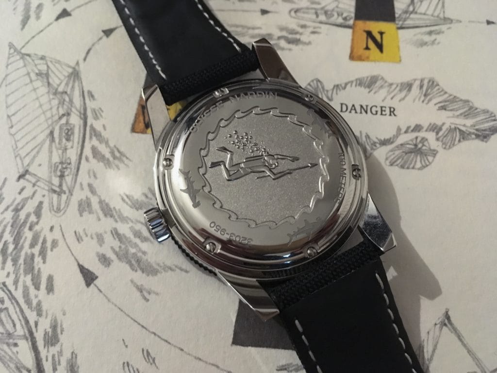 Difficile de ne pas tomber sous le charme de son look vintage. Des aiguilles des heures et des minutes surdimensionnées survolent un cadran noir profond et pointent des index imposants chargés en matière luminescente. La présence d’une loupe magnifie le quantième qui s’affiche dans un guichet situé à 3h. Celui-ci devra être ajusté fin février et tous les mois de 30 jours. La présence d’une petite seconde permet de garder un œil sur le bon fonctionnement du mouvement mécanique à remontage automatique. Une magnifique lunette unidirectionnelle cannelée noire cercle cette composition logée dans une boîte en acier de 42,2 mm de diamètre. La fond du boîtier vissé est orné d’une gravure représentant un plongeur. Avec tous ses atours, la Diver Chronometer se présente comme un garde-temps sportif très élégant à l’instar des autres modèles de la collection.
