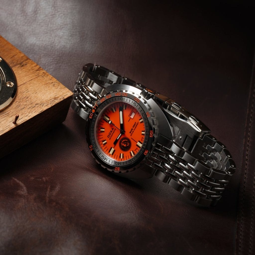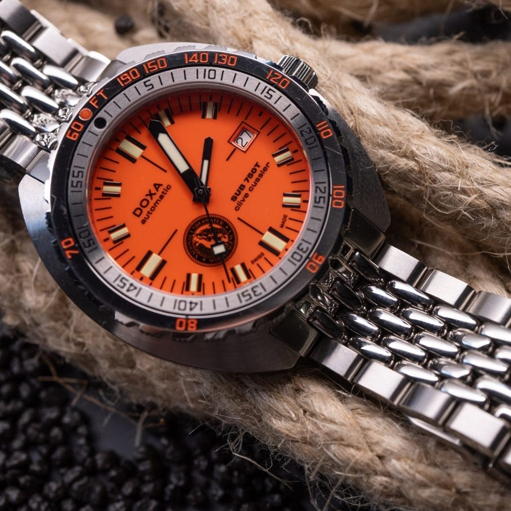 On retrouve le cadran orange emblématique, signe distinctif de DOXA depuis les années 1960, popularisé par Dirk Pitt dans les romans.