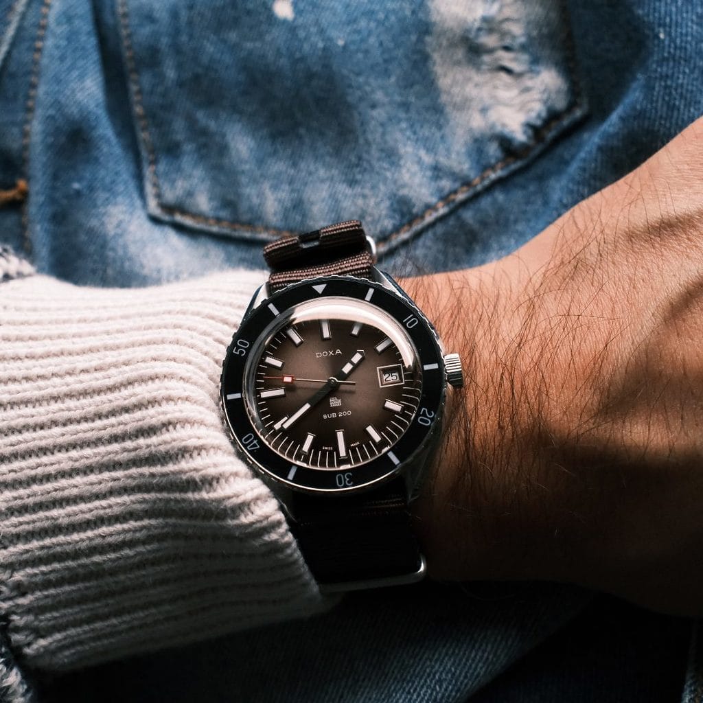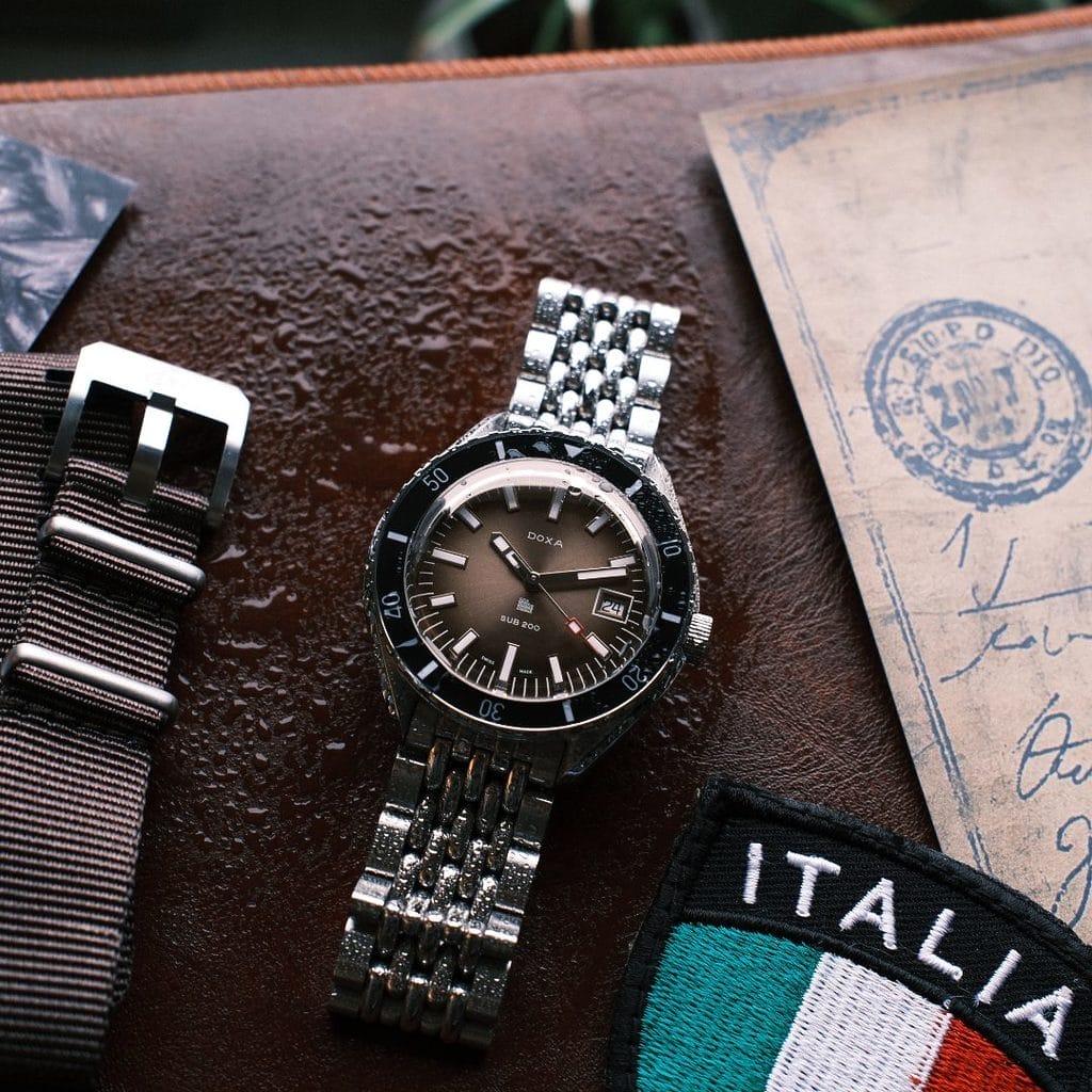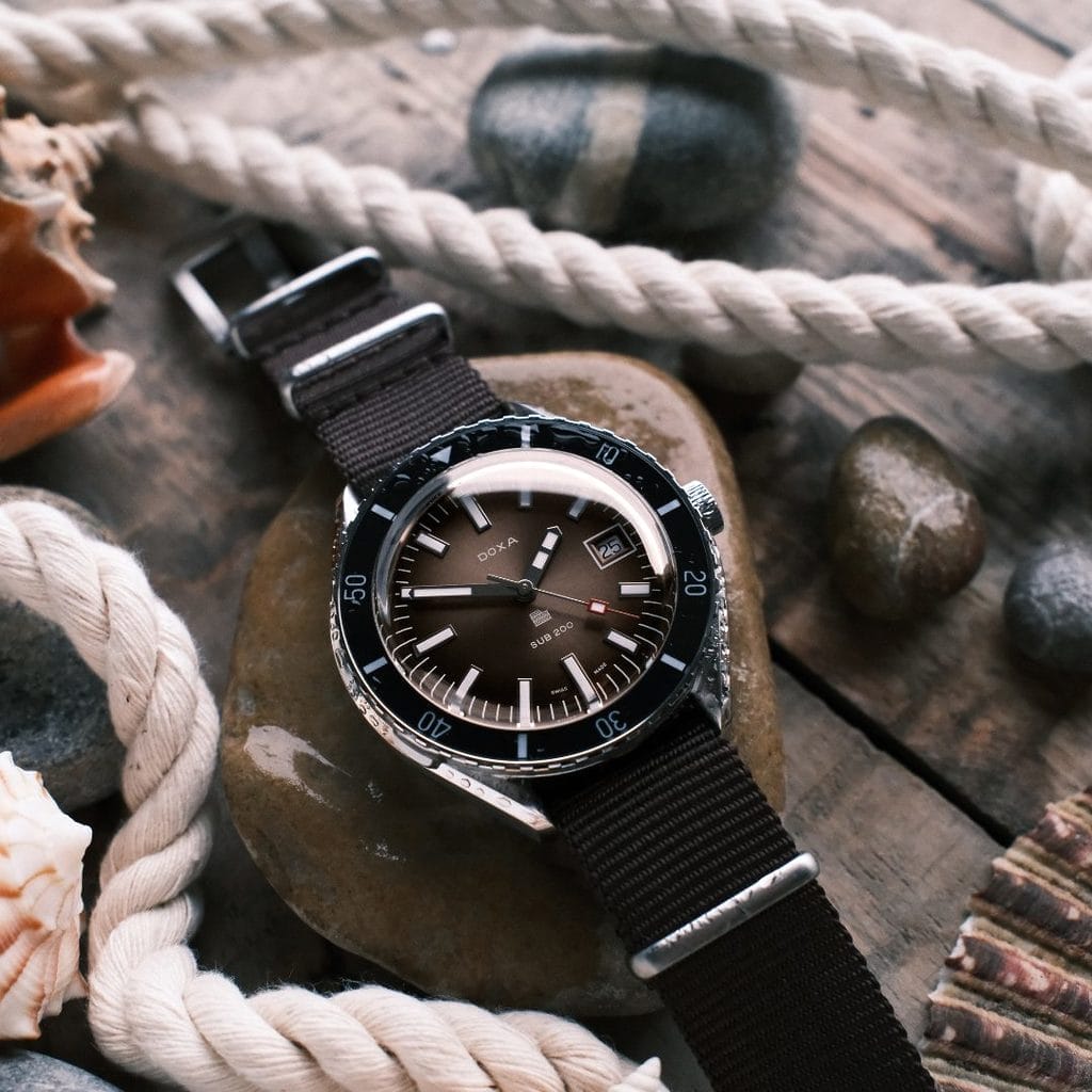 Proposée sur un bracelet acier “grains de riz”, signature historique de DOXA, la SUB 200 Grande Roma conserve ce lien fort avec son passé. Un bracelet à la fois confortable et visuellement distinctif, qui participe pleinement à l’identité de la montre. Pour ceux qui privilégient une approche plus décontractée, un bracelet NATO brun est également livré, offrant une alternative plus légère, presque estivale.