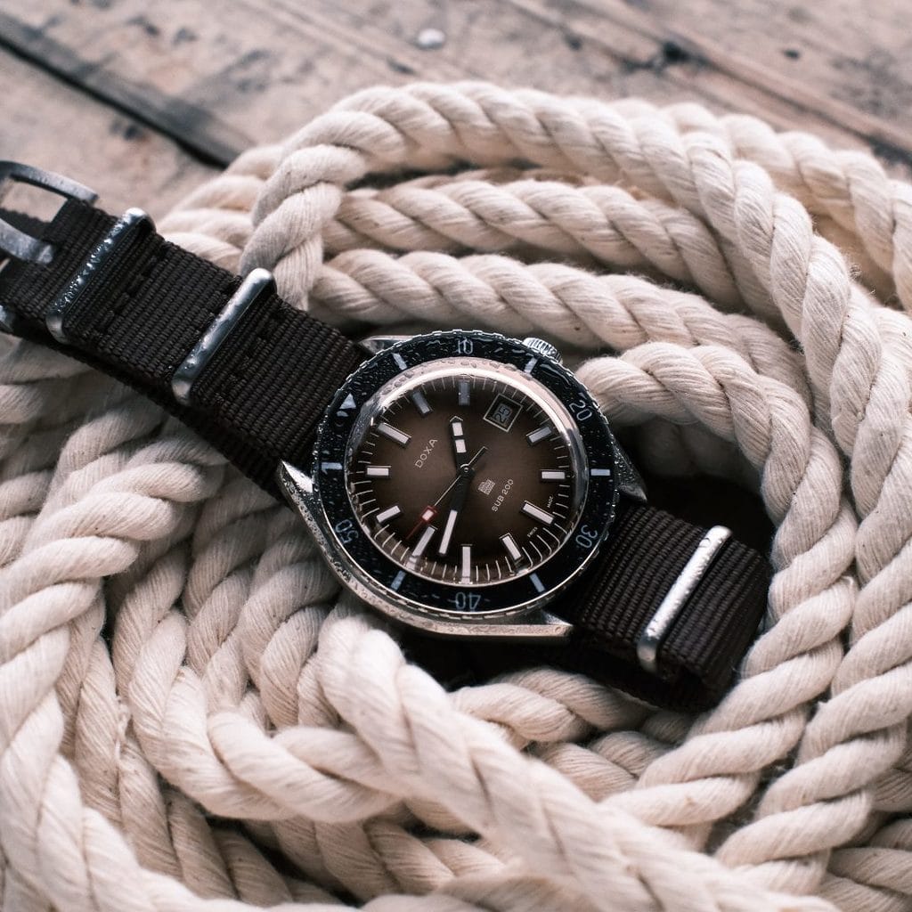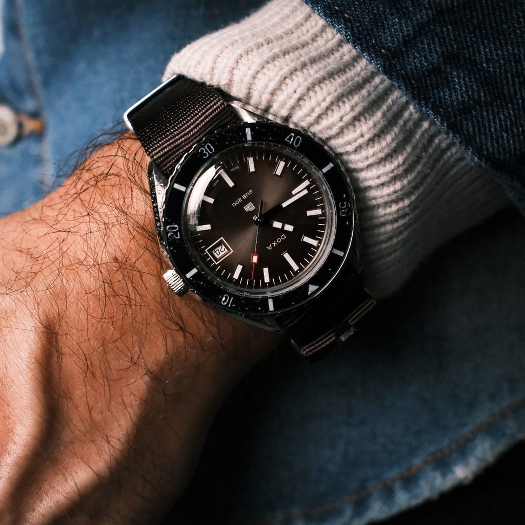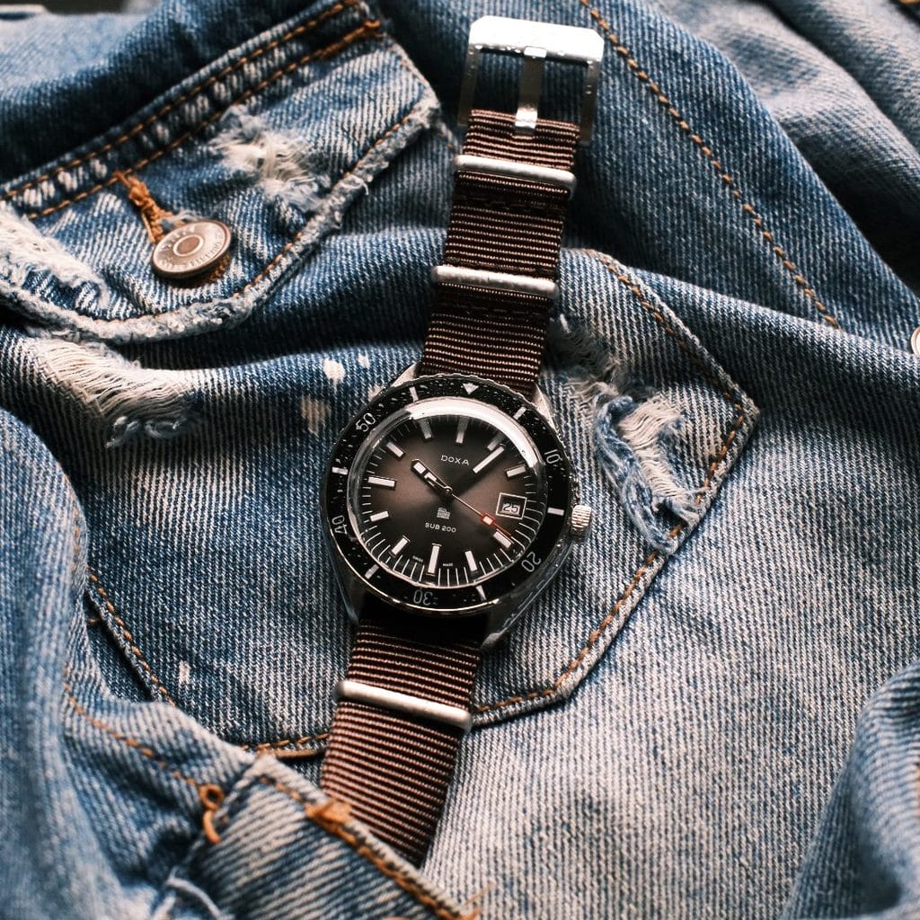 Proposée sur un bracelet acier “grains de riz”, signature historique de DOXA, la SUB 200 Grande Roma conserve ce lien fort avec son passé. Un bracelet à la fois confortable et visuellement distinctif, qui participe pleinement à l’identité de la montre. Pour ceux qui privilégient une approche plus décontractée, un bracelet NATO brun est également livré, offrant une alternative plus légère, presque estivale.