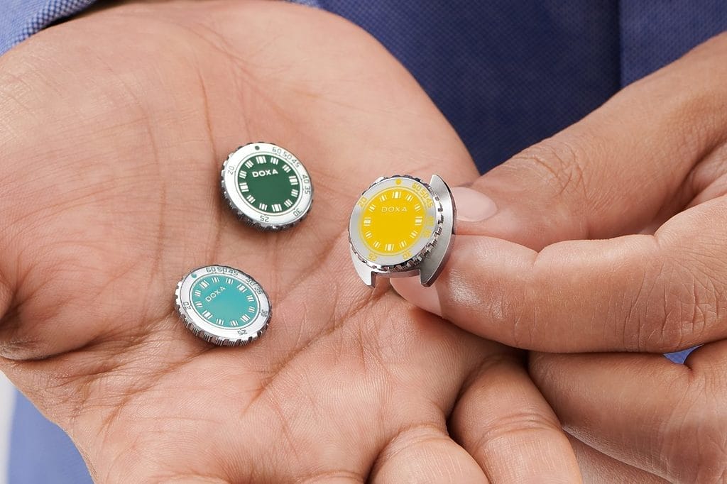 Ces boutons de manchette en acier inoxydable intègrent un mécanisme ingénieux qui, grâce à un système de baïonnette, permet de remplacer aisément un petit disque poli aux couleurs interchangeables. Ainsi, les utilisateurs peuvent choisir parmi les sept couleurs emblématiques de DOXA : le légendaire orange Professional, le noir Sharkhunter, le bleu Caribbean, le turquoise Aquamarine, le jaune Divingstar, le blanc Whitepearl et le vert Sea Emerald. Chaque combinaison de couleurs permet d’adapter l’accessoire à l’humeur du jour ou à l’occasion.